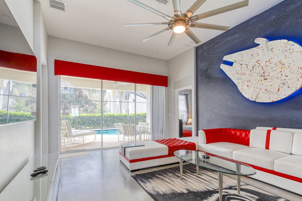 🔮 2 mi to Disney 🤿 Free Waterpark 🏋️Gym 📺 Smart TVs & Cable 🏊♂️ Heated pool 💲 Free Pool Heating 🔐Gated Resort 🎬Movie Theater 🕹️ Arcade 👩🍳Fully Stocked Kitchen 🎥 Themed Room 🏀Playgrounds Welcome to Sunny Star Wars home in Windsor Hills Resort, only 10 mins from Disney. Experience open living, sunshine, and safety in our gated community. Welcome home to create cherished memories!