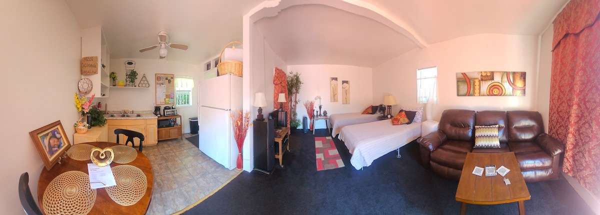 PRIVATE MINI-STUDIO WITH: • PRIVATE entrance • PRIVATE exterior FREE parking • PRIVATE patio (SMOKING ALLOWED outside on patio only) • PRIVATE kitchenette • PRIVATE bathroom • Queen bed & single sofa bed -- please advise IN ADVANCE if you'll be needing the SOFA BED for your stay • Small fridge & flat-screen TV with HBO • Sleeping accommodations for up to two adults. Best suited for a single occupant, couple or two close friends. (We are NOT approved for more than two guests.)