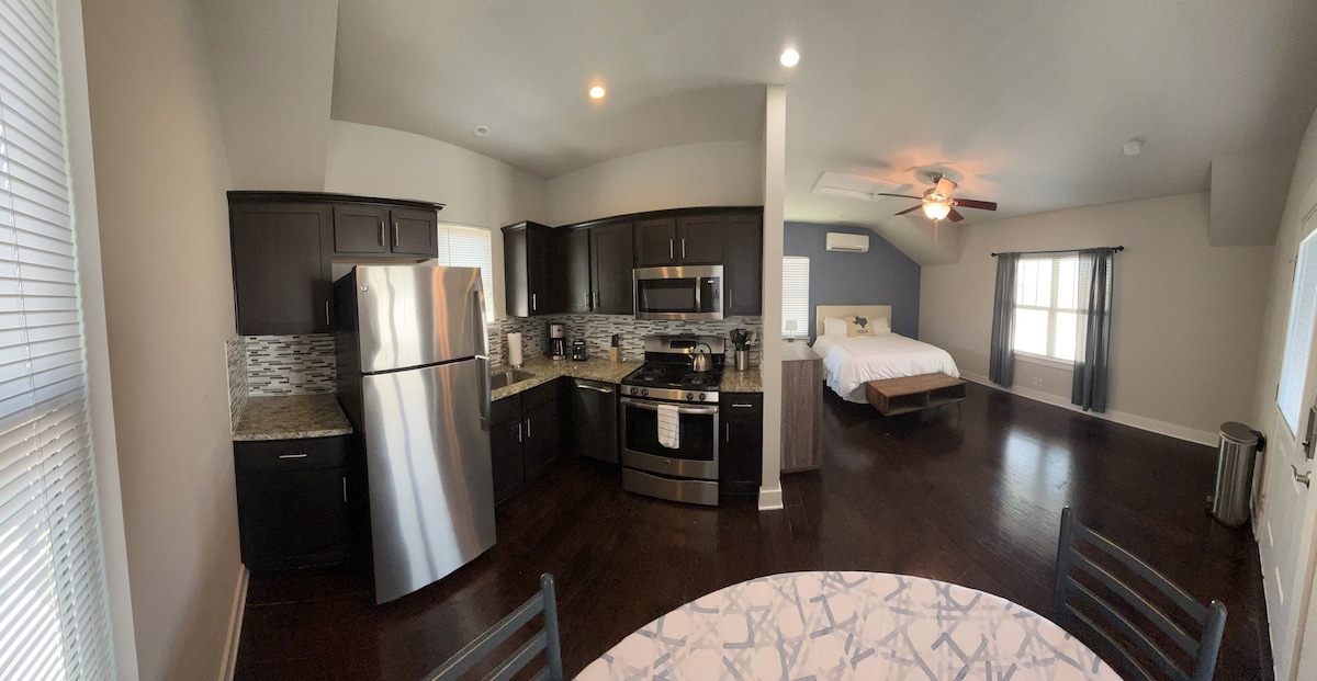 (Imoroved August)Top Floor Studio with Balcony Wake up to sunshine in this stylish modern studio, located on the top floor of the front building (with two other units). Climb the stairs to your private retreat featuring a balcony, a full bathroom with tub, and a kitchen with gas stove and fridge. New furniture (purchased May 2025) adds comfort and style. Just minutes from Austin’s best tacos, live music, and coffee spots, this space is perfect for SXSW stays, weekend getaways, or remote work.