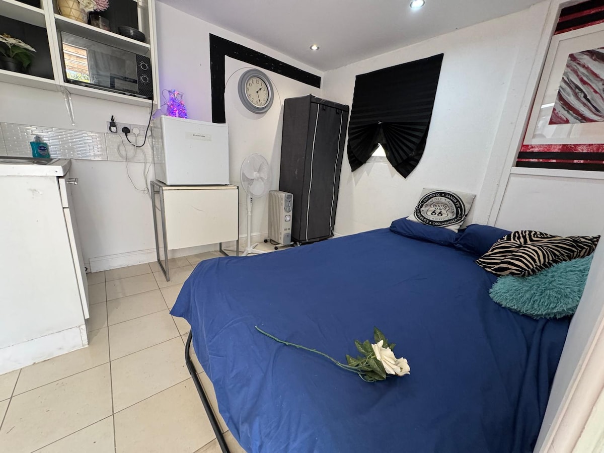 A cosy modern ground floor 1 bed (sofa bed) within our lively family home, with all the basics including own en suite shower room /wc and TV. It is the perfect place for a short stay. There is a small counter to make drinks and small meals including mini fridge freezer and microwave oven. Alternatively if you are preparing a big meal you can use the family kitchen just text me in advance so i can unlock the door and remove our to friendly /energetic dogs. Guest are welcome to use the gas BBQ