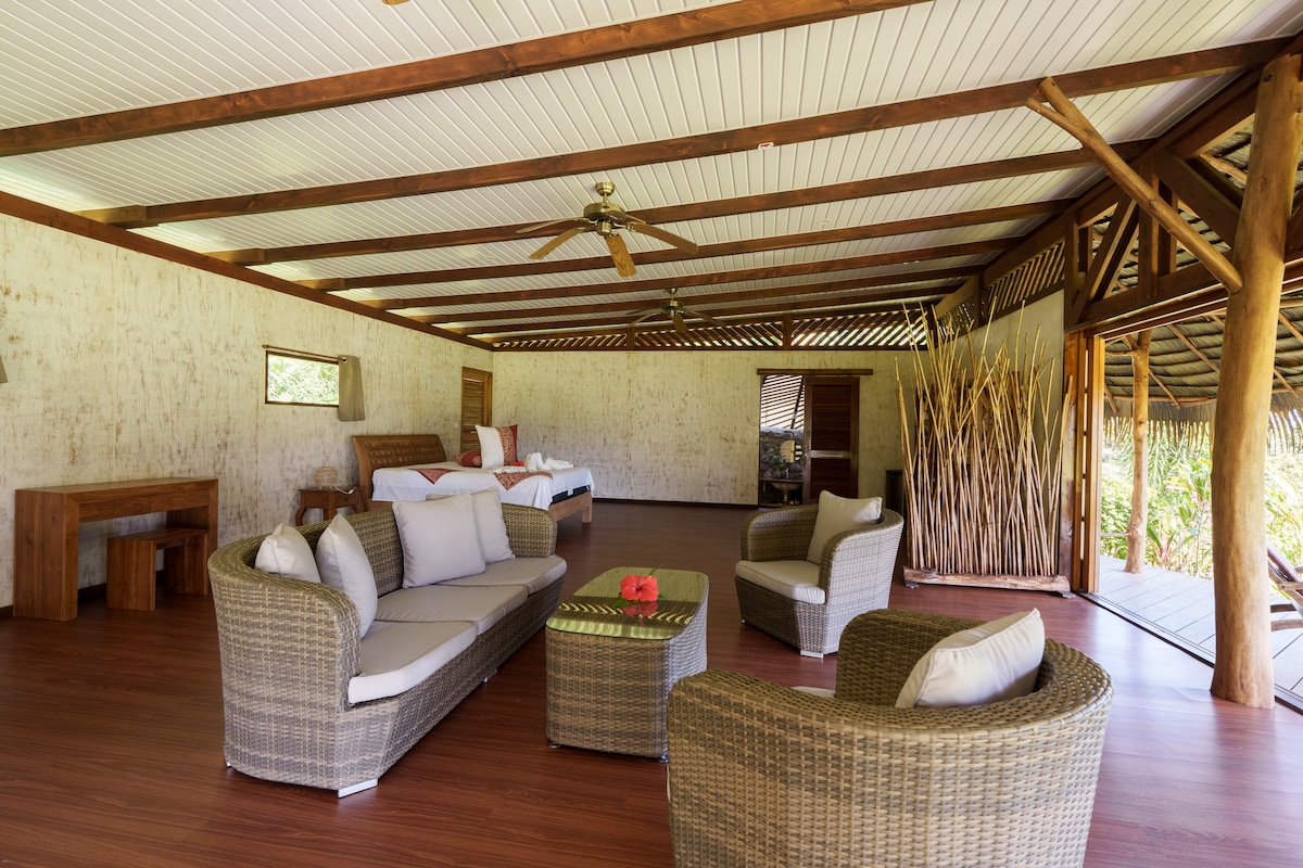 Welcome to your peaceful retreat in paradise! This spacious 100 m² villa with a private terrace and jacuzzi is the perfect spot to relax, surrounded by lush greenery and overlooking the lagoon. Each evening, enjoy breathtaking sunsets in a serene and exotic setting. Inspired by neo-Polynesian architecture, the villa blends local charm with modern comfort to offer you an unforgettable stay.