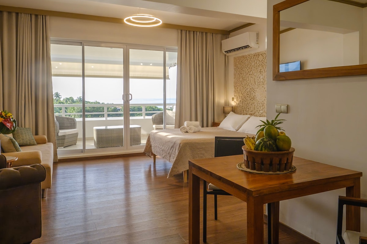 Dans lieu paradisiaque en bord de lagon se trouve un studio de 71.5m2 dont 21.5 m2 de terrasse comprenant un coin cuisine entièrement refait et un coin séjour avec canapé.A l'intérieur, une salle de bain avec douche à l'italienne, double vasque ainsi qu'un dressing et une mezzanine avec un lit de 160x200 ( possibilité de rajouter deux matelas de 90x190 pour les enfants). Le tout donnant sur un jardin privatif fleuri (douche extérieure) et en bout le lagon turquoise...
