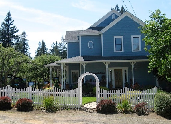 Our home is a Victorian farmhouse on 7 acres in an apple orchard with a redwood grove, a pond, and barns. The main house, built in 1910 and remodeled in 1996, is surrounded by an English garden and is on a quiet country lane. The upstairs is a lovely private suite with a private entrance. We book to only one party at a time (read full description) and the home is fully air conditioned. I am a professional artist and Al is an author of children's books. Come visit our little piece of heaven!