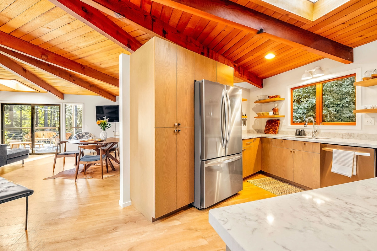 **Recently refreshed/re-furnished!** This house was named 'The Ranch House' by its architect Don Jacobs, this updated 70s cabin is a forest getaway with modern sensibility. The house is surrounded by redwoods & has 2 large decks, 1 w/ propane firepit w/ ample seating, the other w/ hot tub. Living room has picture windows w/ forest views & Morso wood-burning stove. Guests are encouraged to enjoy the hiking trails, pools, and outdoor amenities. House comfortably sleeps 4, plus fiber-optic internet