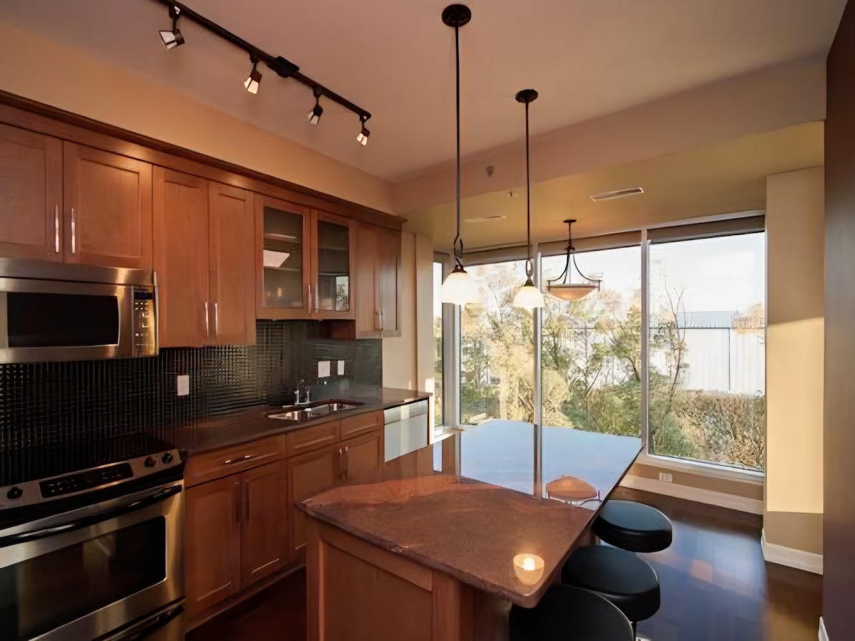 Stay in style at this luxury 2BR/2BA apartment with 9-ft ceilings, oversized windows, quartz counters, stainless steel appliances, in-suite washer/dryer, and private balcony with city views. Enjoy spacious living with smart layout, queen beds, dining for 4, and stocked kitchen. Steps from transit, shops, dining, and EV stations. Wheelchair accessible with elevators, rooftop patio, and security. Perfect for families, business, or solo stays.