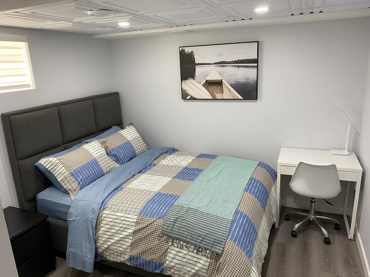 This is a new Private-built basement apartment. The rooms are all the comfort of a home, with king and queen beds that are warm and cozy for a perfect fit. It is located in the serene environment of the city with a functional transit bus system. Parking spot on driveway It also has a separate entrance. Free WIFI, TV with Smart Cable, living room, washroom, kitchenette. It is easy at this unique and tranquil getaway.