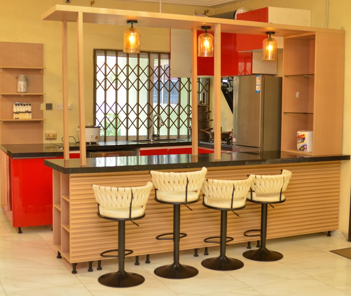 Stunning, modern studio designed for comfort and style. This sleek, secure space features a king-size bed, walk-in closet, fully equipped kitchen, 55" SmartTV, high-speed internet, A/C, and a standby generator. Ideal for solo travelers or couples. Located in a peaceful neighborhood just 25km from Accra Airport. Airport pickup and drop-off are available upon request for a fee. Secure parking is available. Please note light church activity nearby on Fridays (9am–11am) and Sundays (10am–1pm).