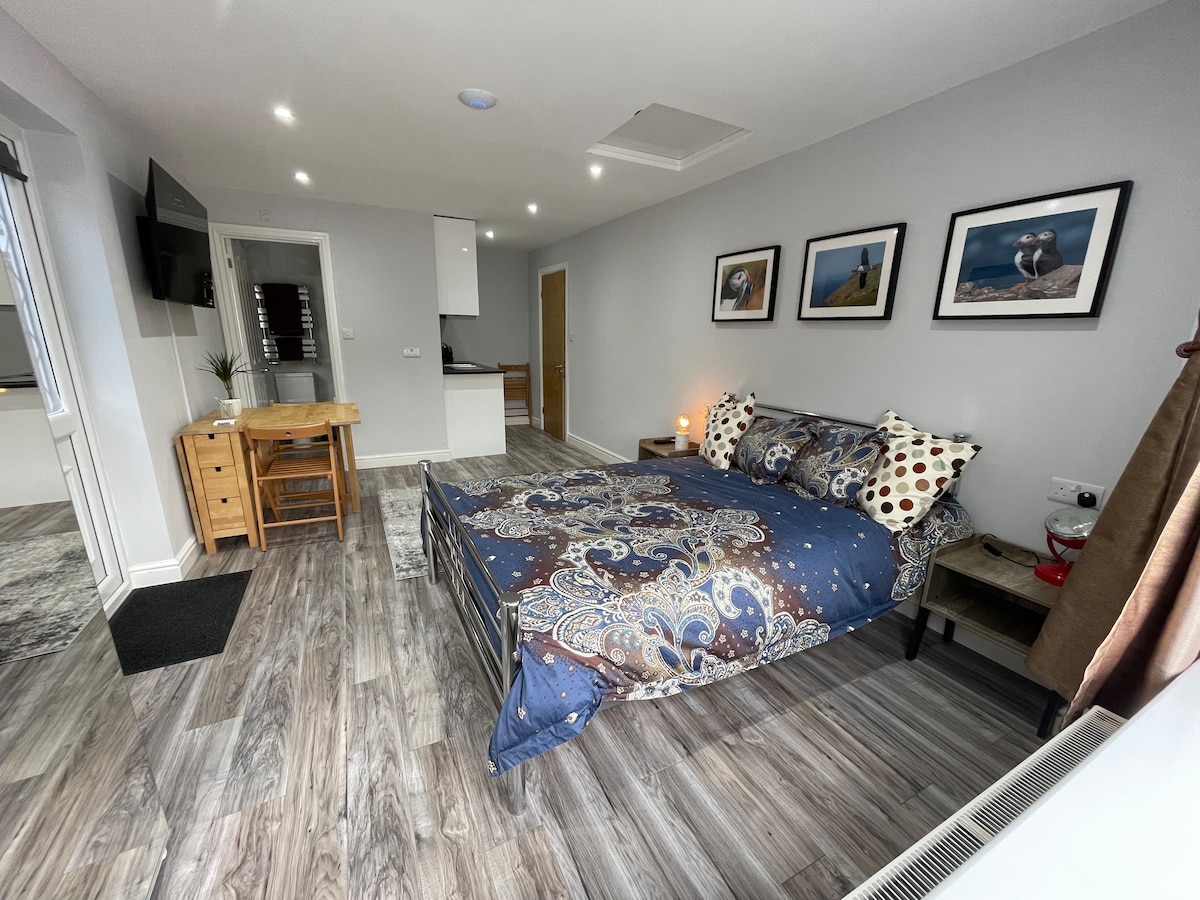 A lovely indendant apartment at the bottom of our garden secluded by trees . the apartment has a nice outside area with patio table and chairs . Inside there is a large open plan kitchen , dinner, lounge with a sofa bed and a well equipped kitchen with double oven , fridge freezer , dishwhaser , whashing machine microwave , toaster, kettle and much more . theres a large smart tv and wifi , dinning table . bedroom with king size bed and built-in wardrobe . bathroom with walk-in shower .