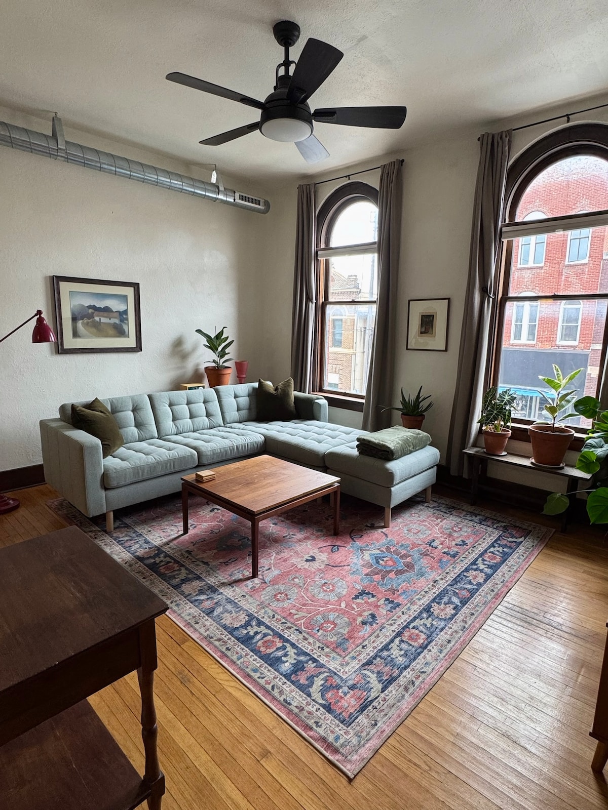 A Lofty View, is an elegant and spacious loft overlooking Historic Water St and the scenic northern bluffs of Decorah. The entire loft, providing almost 2,000 sqft of space to spread out yet is cozy enough to feel right at home. With its beautiful hardwood floors, soothing color pallet and casual décor, this naturally lit space is the perfect place to relax and enjoy family time or gather with friends. Sleeps 6. Two bedrooms with queen beds and one pullout queen sofa bed in living room.