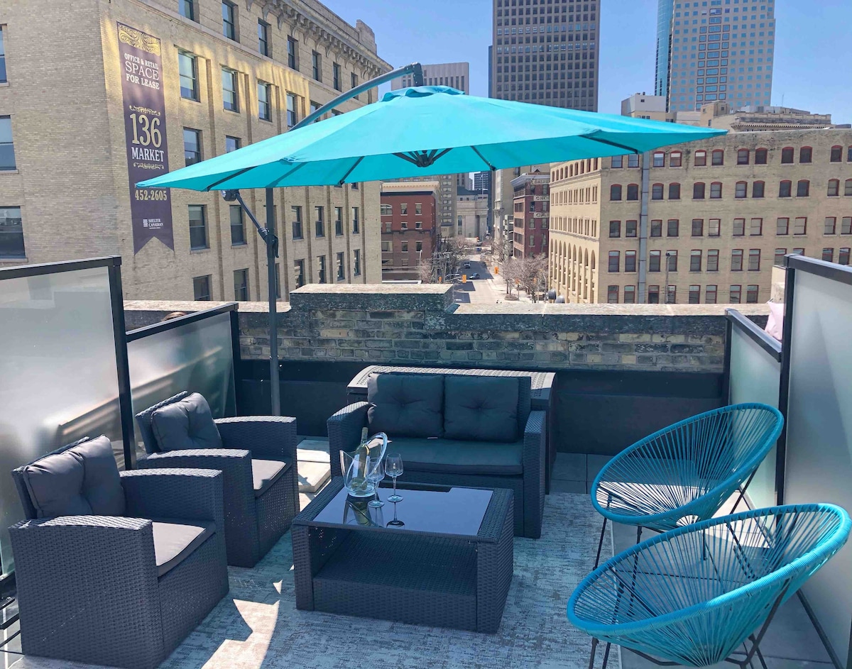 *NEW* parking in the exchange is difficult, we are now offering FREE parking with your stay! Fabulous century old warehouse conversion in the heart of Winnipeg's Exchange District! Where historical charm such as original brick meet modern amenities including private rooftop patio, in-suite laundry, high speed wifi, luxurious linens, and a fully stocked kitchen. This space is tastefully decorated and has everything you may need to have a comfortable night in, or fun night out in the Exchange!