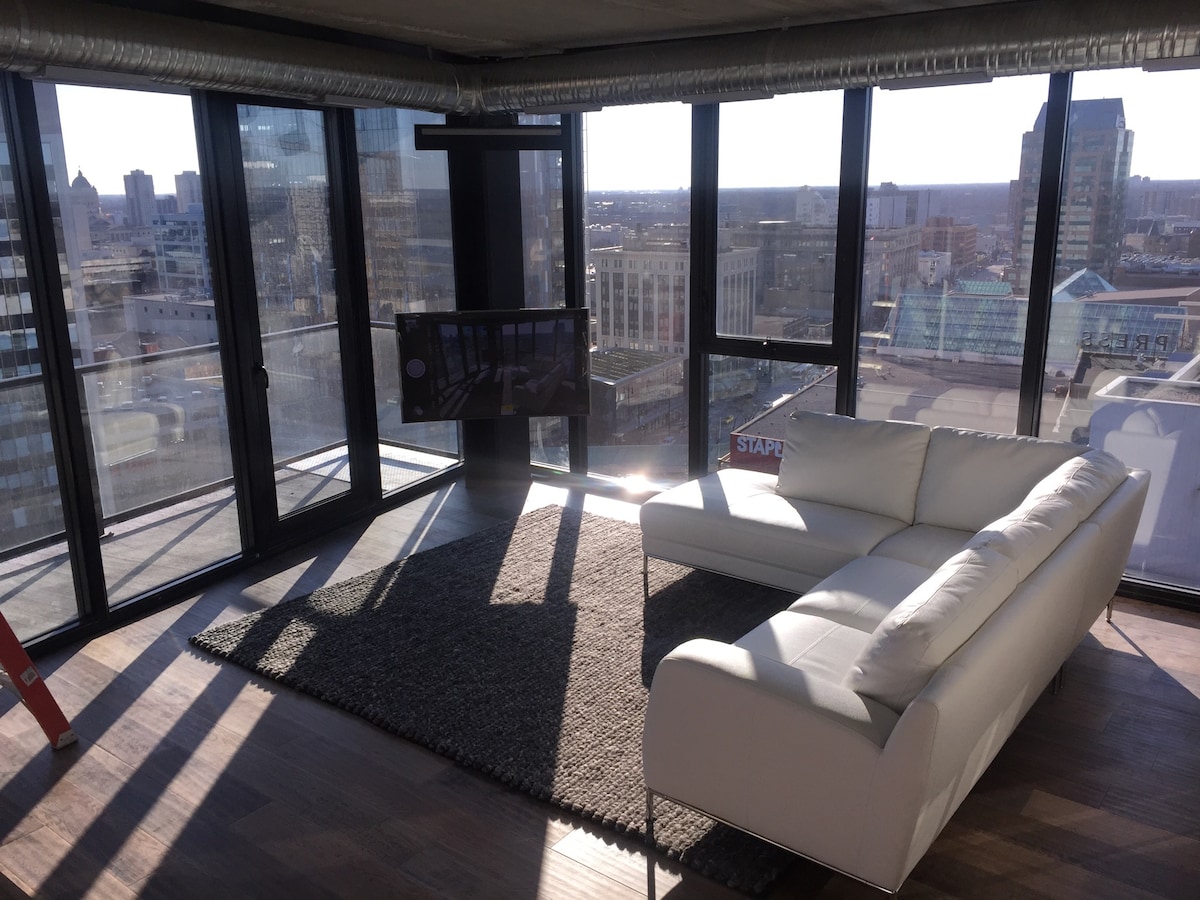 We provide a FREE parking spot in the parkade (located right beside the building) which most hosts do not provide. This is a 4 storey parkade with security on site 24/7. Book with us to enjoy a stunning suite on the 10th floor in the centre of downtown Winnipeg, with floor to ceiling windows overlooking downtown Winnipeg. A stone's throw away from Canada Life Center/BellMTS Place, True North Square, dining and nightlife, The Forks and the Historic Exchange District.