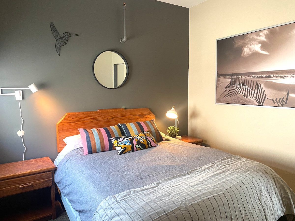 Whether you are new to Canada, here for business, or visiting friends or family, our 1 bedroom suite is ready to accommodate you. This river-view suite has breathtaking views from the second floor and is equipped with everything you need for a comfortsble stay. The bedroom has a queen size bed, boho living room a couch and tv, desk and private bathroom. Located in the heart of St. Vital, close to public transit, malls, hospitals, and downtown, you will be able to navigate Winnipeg with ease.