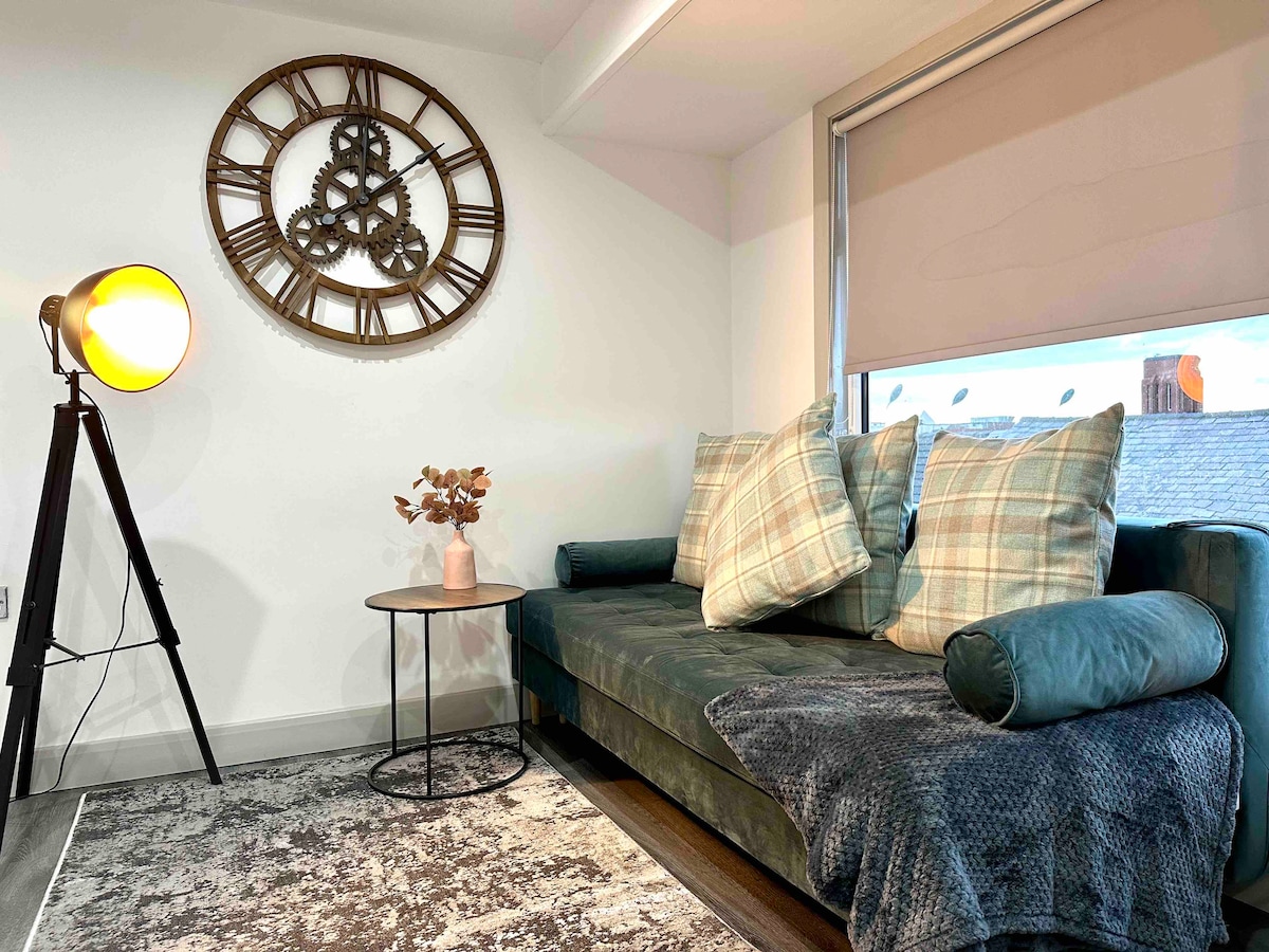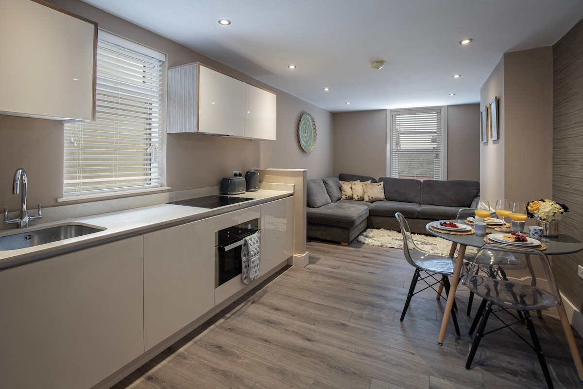 Enter via our Clifton Square entrance. This second floor apartment boasts a loft style living area and direct views of Clifton Square, with a double sofa. A large kitchen and dining space with table and chairs for entertaining, that overlooks the living area. A snug bedroom, with king-size bed and side table, with velux windows, double wardrobe, mirrored vanity area with seating. The bathroom has a dual- head shower, double sink, heated towel rail and toilet.