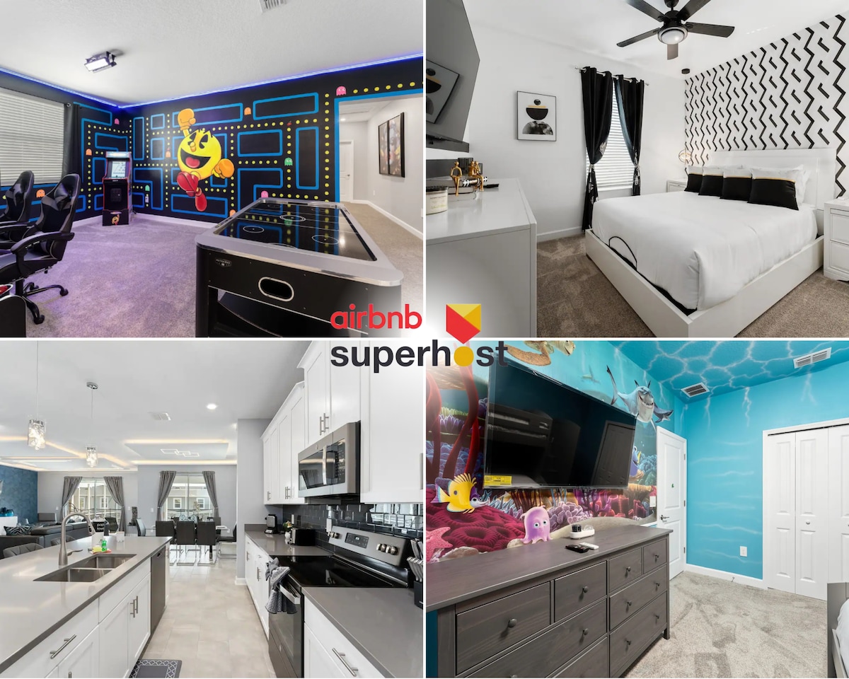 Professionally designed for an unforgettably FUN and HASSLE-FREE vacation! ☆ ONSITE WATERPARK ☆ Themed GAME ROOM with ARCADE and premium gaming lounge ☆ Ultra comfortable beds. Sleeps up to 11 guests ☆ Custom-themed Moana bedroom ☆ 2 Luxury King Suites + 1 Queen Suite ☆ Luxury linens ☆ Private heated POOL ☆ Fully stocked COFFEE BAR ☆ Fully stocked kitchen with cookware, dinnerware with extras ☆ Popcorn maker ☆ Minutes to Disney World and Universal Studios. ☆ Family-friendly