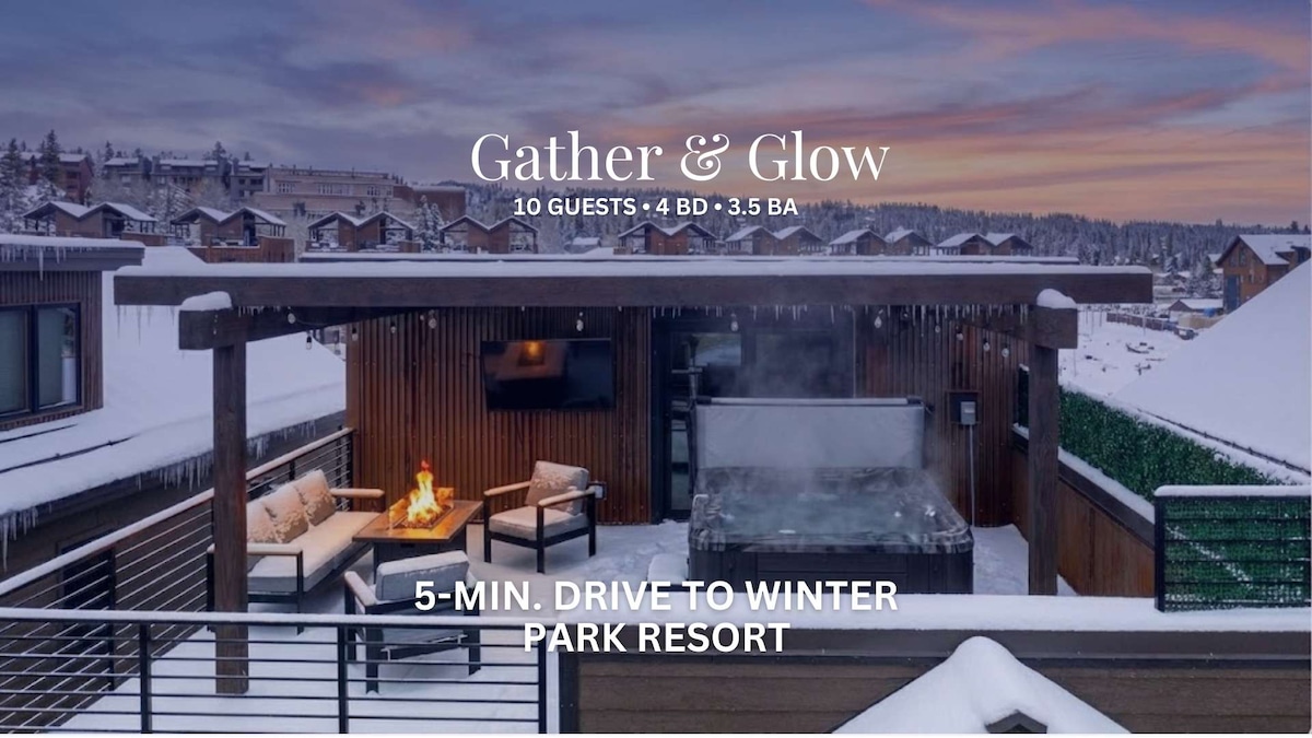 Escape to Gather & Glow, a luxe townhome in downtown Winter Park with mountain views, a private rooftop hot tub, and a game room. Walk to shops, dining, and the free shuttle to Winter Park Resort. Features include 4 bedrooms (sleeps 10), a chef’s kitchen, Sonos sound, EV charger, boot warmers, and more. Perfect for families, groups, or anyone seeking comfort, style, and adventure—right in the heart of it all.