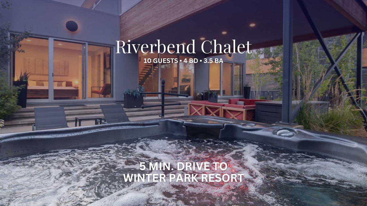 Escape to Riverbend Chalet, a stunning 4BR/3.5BA modern home on the Fraser River in Winter Park. Designed by a Frank Lloyd Wright protégé, it features a chef’s kitchen, radiant floor heating, suspended fireplace, private hot tub, and riverfront deck. Sleeps 10 with 3 king beds and 2 full beds. Just 5 minutes to Winter Park Resort and steps from trails. The perfect blend of luxury, nature, and convenience for your Colorado mountain getaway.