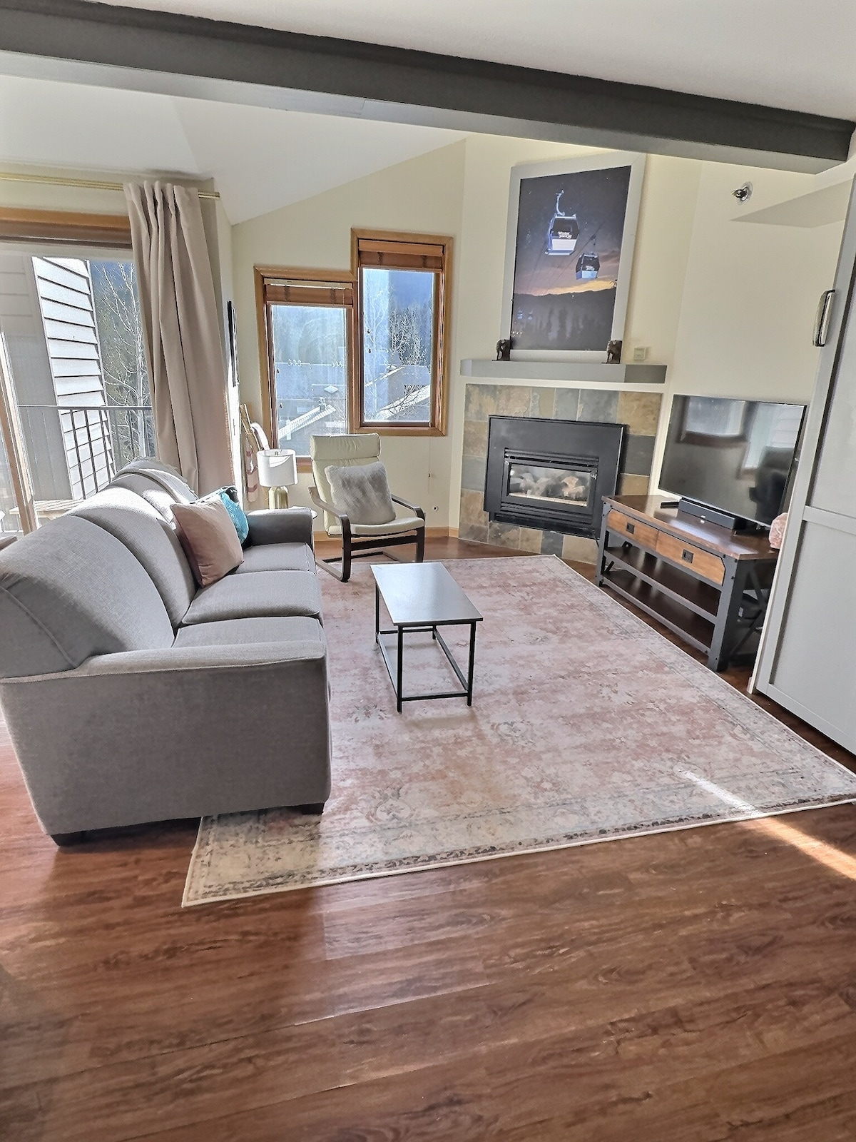 Two bedroom, Two bath, top floor condo with three private balconies. Our fully equipped kitchen comes complete with all the amenities you need to prepare your favorite meals, and we provide complimentary toiletries for your convenience. 15 minute walk to main street bars and restaurants and on the free ski shuttle line to the Mountain or Main Street. Take advantage of our free parking in front of the building and unwind after a long day on the slopes or trails in the community outdoor hot tub.