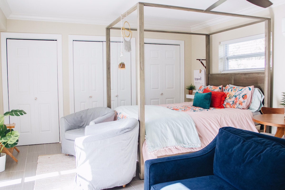 255 sq ft studio- queen bed, workspace, kitchenette, large bathroom, private yard area & entrance. This gem is clean & quiet w/ complete blackout in bedroom. Bathroom has tons of natural light & 3 shower heads. There’s TV w/Roku, microwave, fridge & Keurig. Comfy, peaceful at I-4 Par exit # 44. $20 pet fee No cleaning fee. Universal 11 mi Kia Center 3 mi Airports (MCO) (SFB) 23 mi Orlando City Soccer 4.6 AdventHealth Orlando 0.6 mi Orlando Health, Arnold/Winnie Palmer 3.8 Rollins College 1.9