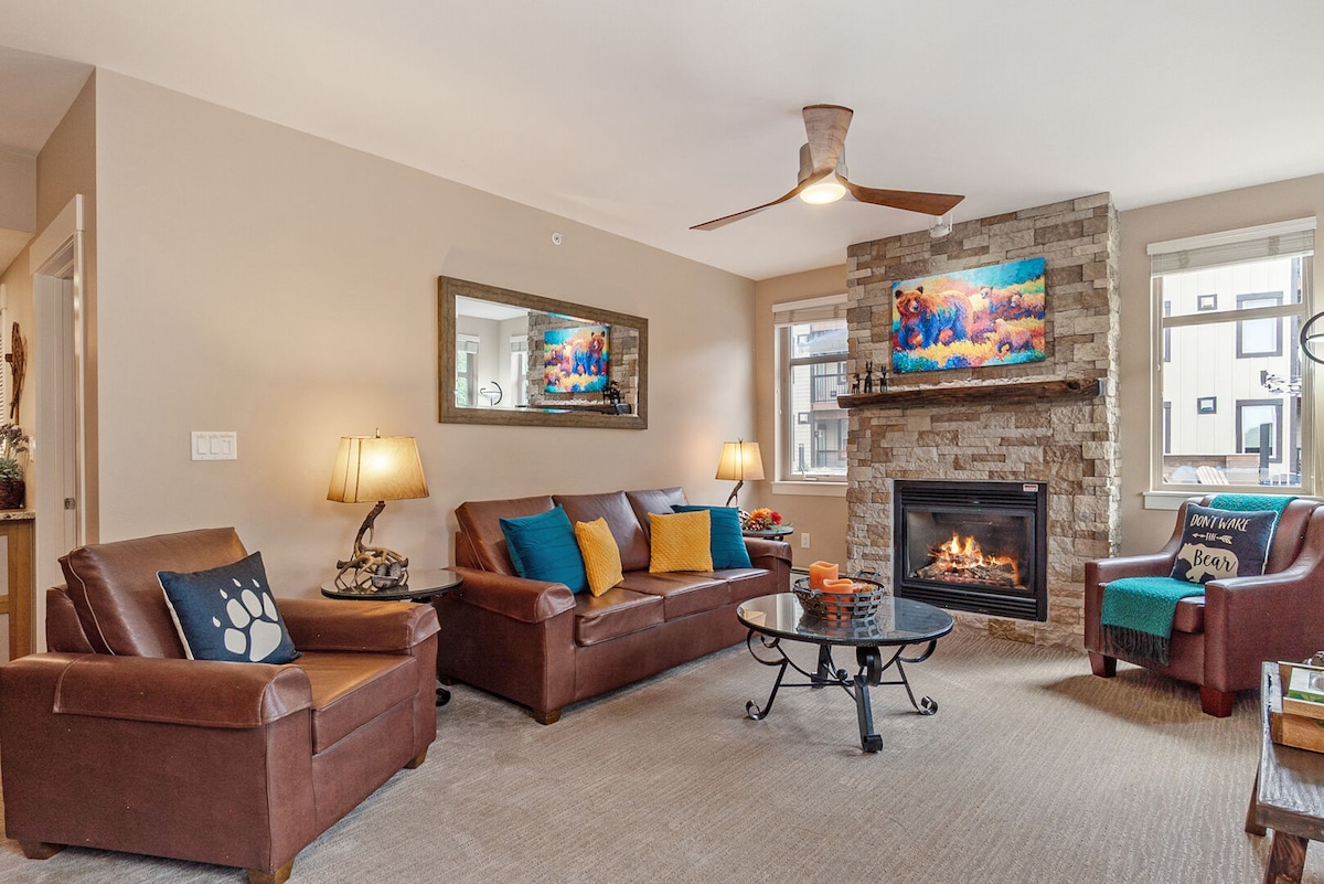 Elevate your getaway in this cozy mountain condo, wrapped in mid-century charm and breathtaking views. Enjoy the mini Pub, snuggle up by the fireplace, or take in the mountain views. Sleep in luxurious comfort, and dine with a ski lift mural as your photo-worthy backdrop. Put a vintage record on, host a game night marathon, or soak in the infinity-style hot tub. The slope is located directly behind the building and you can walk or ski to the Winter Park Resort village center.