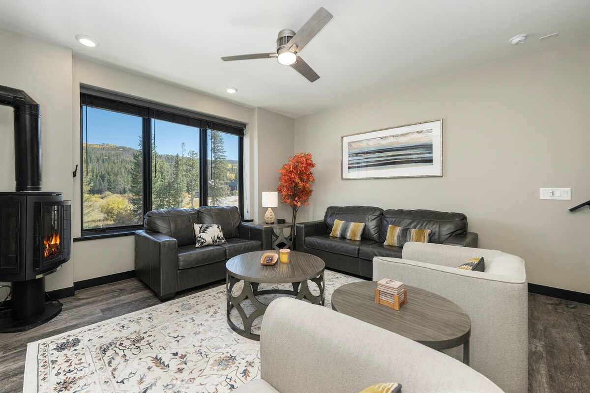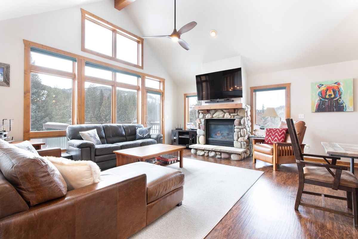 NO PETS Walk to resort (Directly outside the “gate”) Gondola, Shops + Dining. Or, take the free shuttle - 50 seconds on the bus, that's it! Highly Sought After Trademark Development - 1/4 Mile to Gondola Next to the Resort's Blue Spruce Parking lot Outdoor Community hot tub, 360• Mountain View’s 3 story condo, 2 balconies, ski run views FREE bus 7am-2am 3 min drive to downtown, 2 mile walk - paved road along river 65” HD TV, 2 sofas, stocked kitchen 25+book - MAX 8 ADULTS **NO PETS**