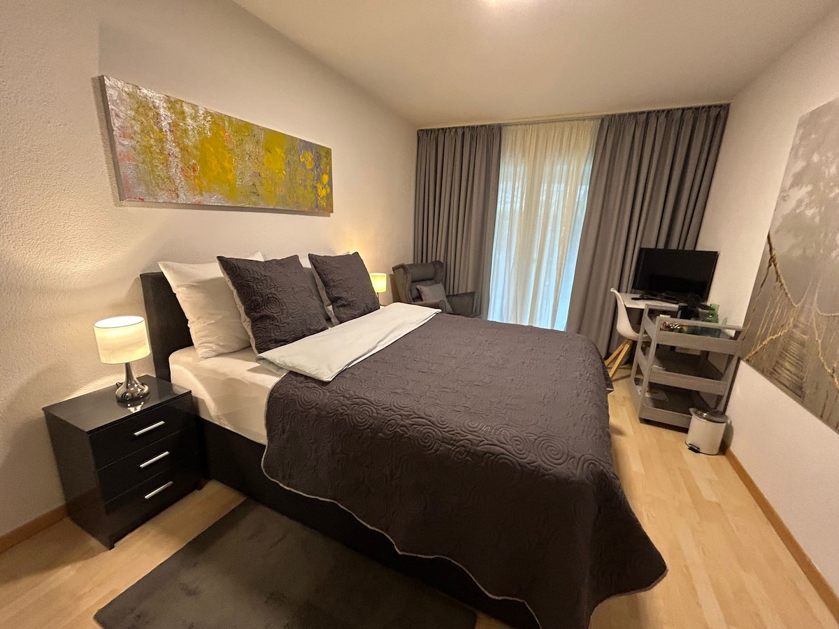Stay in this bright and spacious apartment with free parking, near to Winterthur and the Highway. Sitting on the edge of the countryside you have trains to Zurich and nearby towns together with regular busses into Winterthur. The self contained apartment comprises a king size bed, a king sofa bed, full kitchen, bathroom with double shower, double sinks, washing machine, dryer and a dedicated workspace with monitor & electronic desk. Outside the apartment enjoy the terrace with seating and bbq.