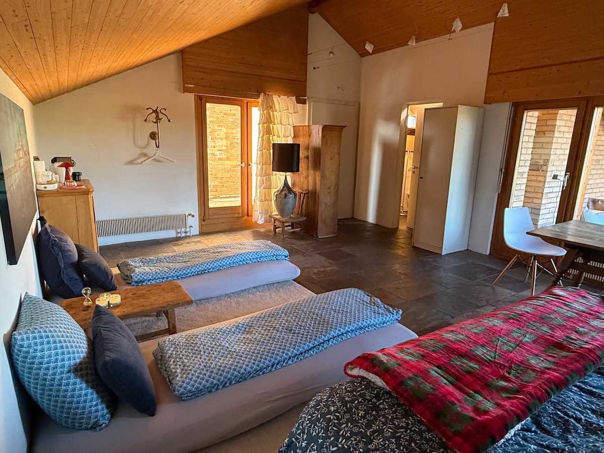 Die stilvolle Garten-Loft in der alten Spinnerei ist ein besonderer Rückzugsort für Designliebhaber und Autofans. Mit viel Liebe zum Detail eingerichtet und eingebettet inmitten der Natur. Die grosszügige private Terrasse ragt direkt über den Wasserkanal und schafft eine einmalige Atmosphäre zum Lesen oder einfach den Tag geniessen. Gäste dürfen zudem die exklusive Liegeplattform im privaten Park mit nutzen. Ein verstecktes Plätzchen, das nur den Bewohnern der Spinnerei zur Verfügung steht.