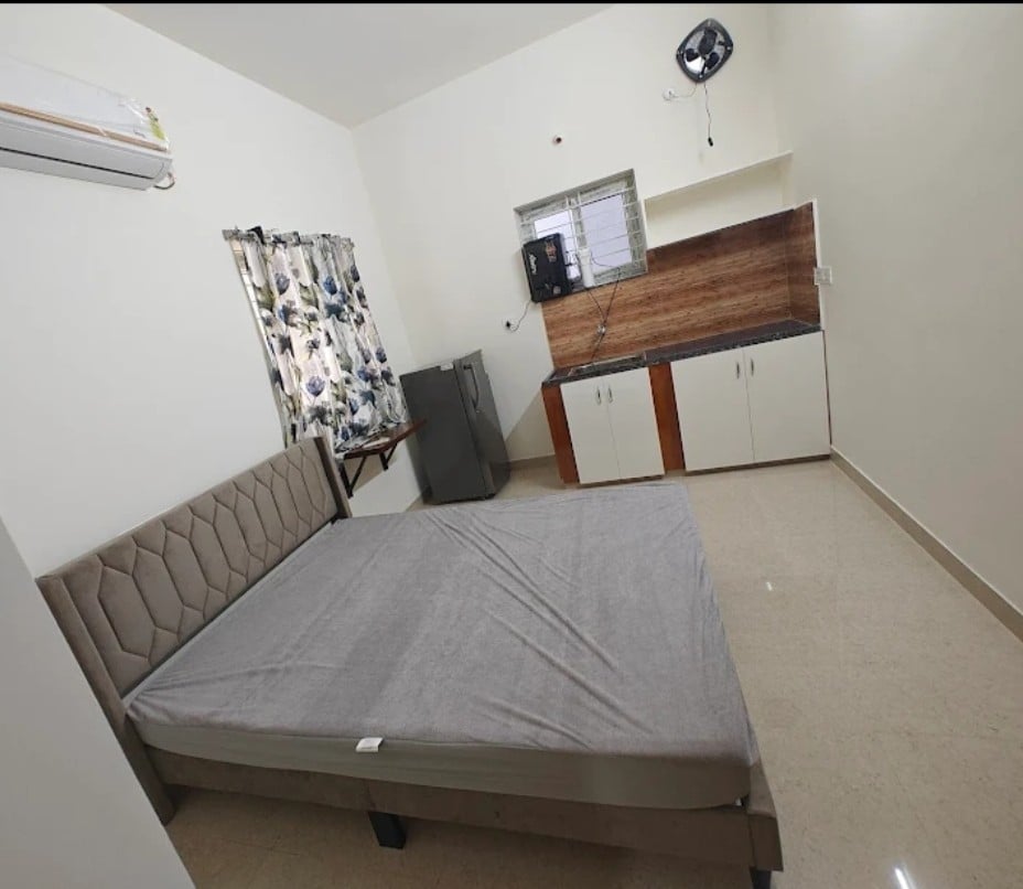 A studio carefully designed by me, offering pure elegance & functionality, making you feel home & comfy. 24 hour male/female guard Short walk: Supermarkets Restaurants Park Hospital You're just: 14 minutes - Financial Dist. 19 minutes - Hitech city 37 minutes - Airport (RGIA) Your stay includes: Parking Snacks Cold/hot beverages Towels Private bathroom Water geyser No-bugs Housekeeping Electric kettle Mini-Fridge Air conditioner 24 hour electricity backup