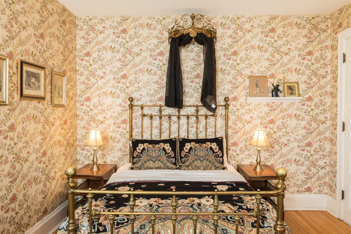The Rose Room is done in traditional feminine flair in alignment with the Victorian era. Located in the lower level of the manor this room offers a cozy, quiet feel without compromising any comforts. En-suite bathroom, sitting area and Keurig coffee maker all in room. *Early Check In is available upon requests made in advance for a fee of $25.00 [Regular Check in Hours 4:00-8:00pm] ***Late Check Out is available upon request for a fee of $25.00 [Regular Check out time is 11:00 am]