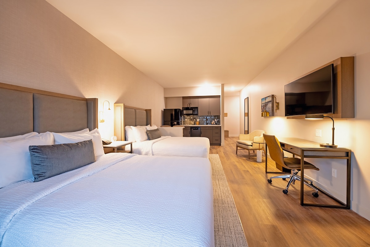 This unit has two queen beds, a private bathroom with a shower, and a workspace. Appliances: Fridge, Microwave, Coffee Pot (included: coffee grounds, coffee creamer, disposable coffee cups, sugar packets, assortment of tea bags.).