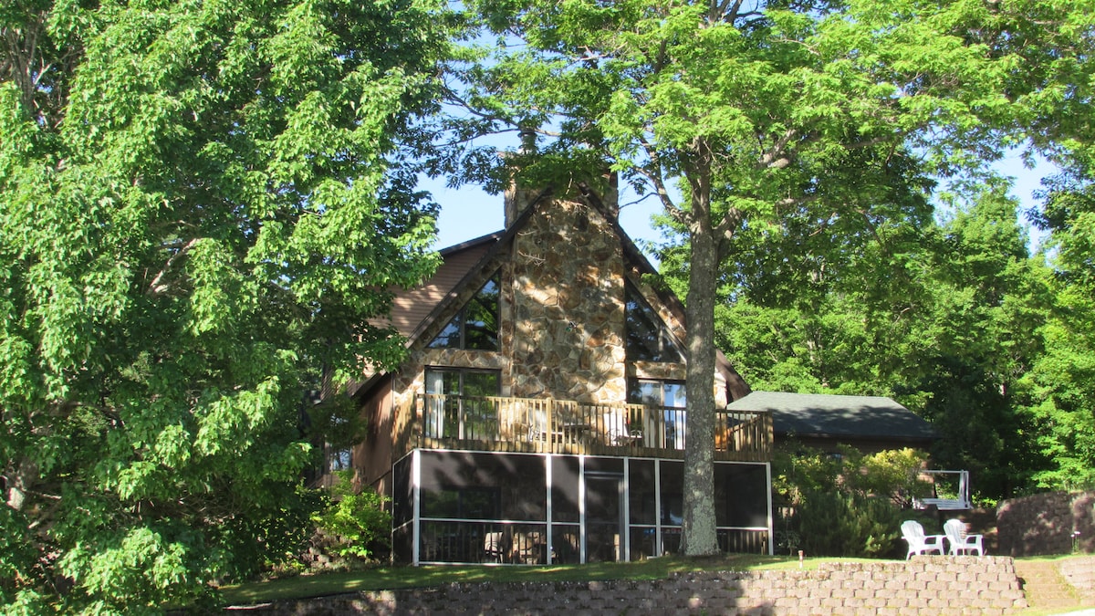 Book a wonderful vacation Up North! Large, welcoming chalet is perched on a wooded hillside overlooking Lake Chetac. Stunning lake views, abundant wildlife & great fishing. Fish house w/water (warm months), electricity, counter, double sink, a freezer and propane heat. Sandy lake bottom at shoreline. Private dock has room for 2 boats. Direct ATV and snowmobile trail access. Please note: must use steps to reach lakeside area of property (see photos).