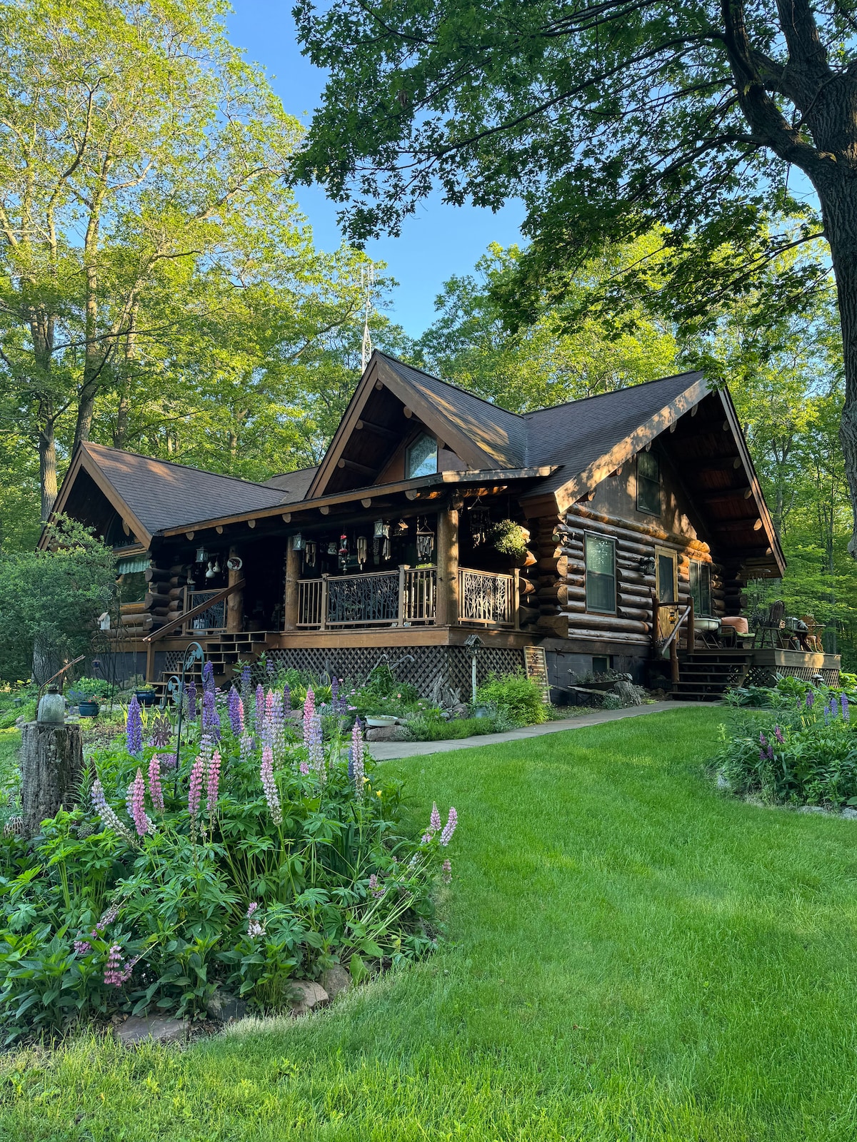 Our cozy cabin in the Driftless Region near Wisconsin Dells offers a peaceful nature escape. Accented with stained glass, it features a lofted reading nook, vintage books, DVDs, puzzles, and quirky décor. Relax in hammock chairs overlooking a wooded ravine where wildlife often wander by. A stone-stepped trail leads down to a private boat dock with swimming, SUPs, kayaks, and a canoe. Enjoy the Zen garden loop, wildflowers, and games, indoors or out. A perfect spot to unwind and explore.