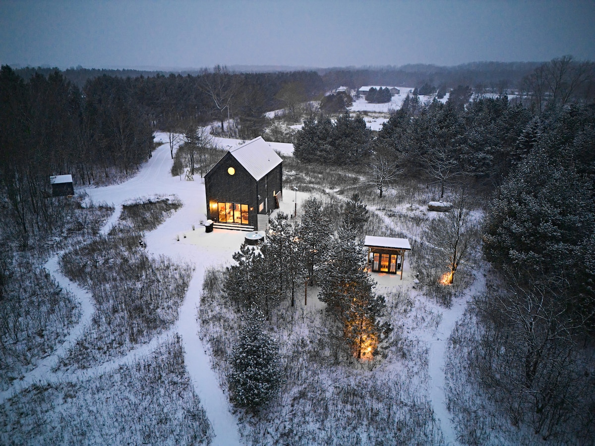 Looking for a cozy winter retreat? Experience the Bird House, a tranquil Scandinavian-inspired private woodland paradise. Melt away stress in the hot tub and infrared sauna as you take in peaceful views of the meadow. Explore snowshoe and cross-country ski trails nearby in the scenic Kettle Moraine. Stream your favorite movie on the projector near the fireplace or unwind at SoLu winery, just a minute down the road. Near Road America, Kettle Moraine State Forest, and Dundee.