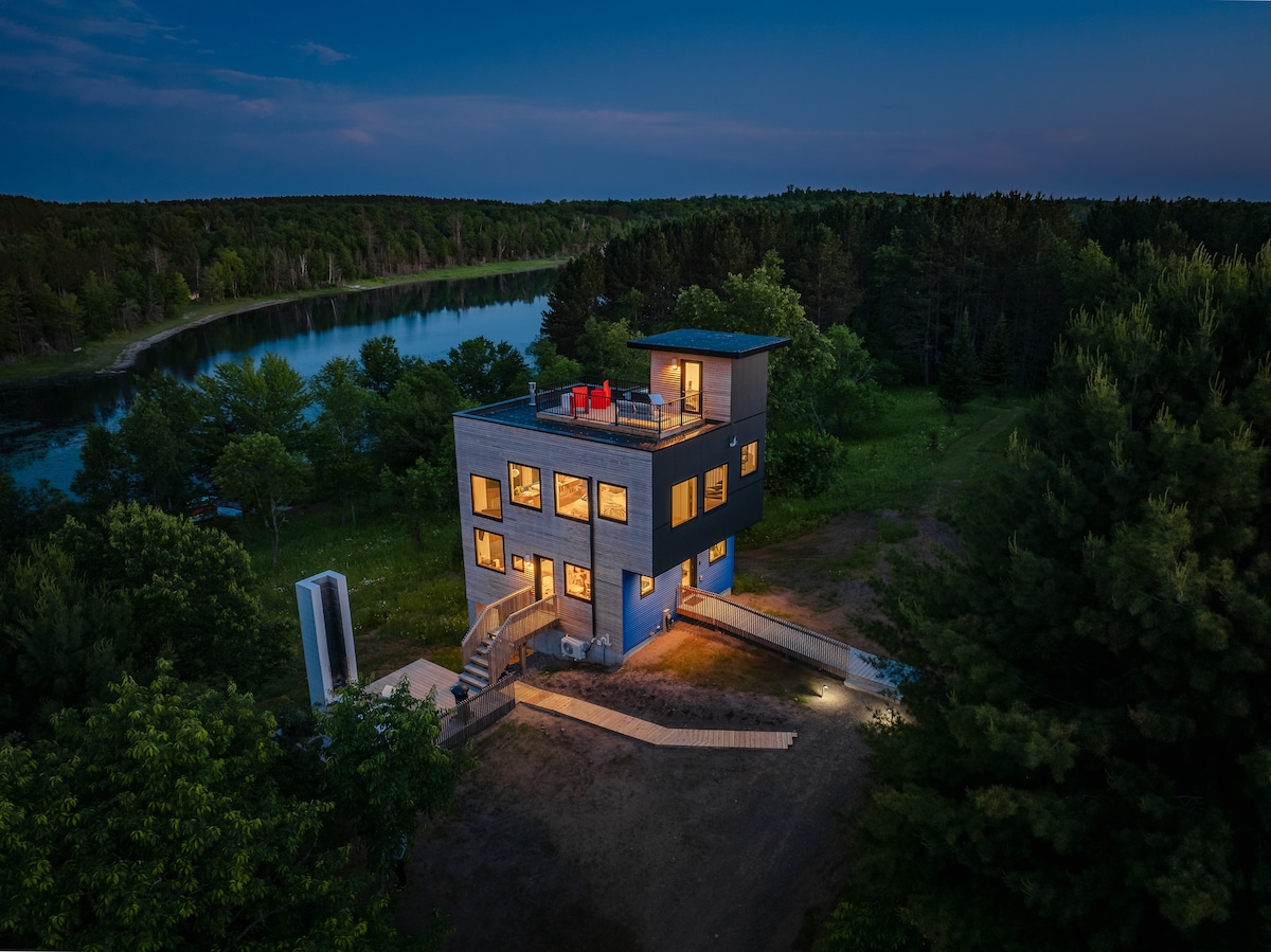 Remote, tranquil, quiet and exceedingly private getaway right on the banks of a protected river, only 1.5 hours from the Twin Cities! Even the beautiful drive there is relaxing. Enter a world of peace and calm deep in the woods. Make delicious meals in a well-stocked modern high-end kitchen, play in the river, relax in the sauna or enjoy a bonfire. This is not your typical cabin but a spiritual eco-oasis with a unique eclectic blend of modern, rustic, Native American and Japanese aesthetic.