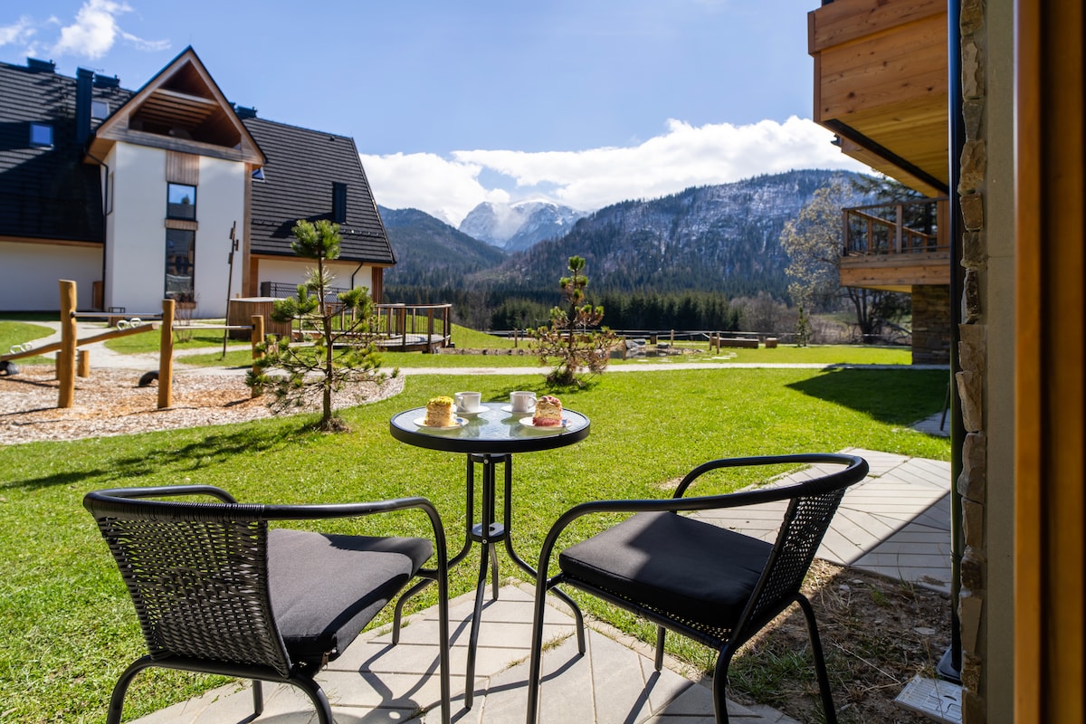 Domek z przestronnym salonem z widokiem na Tatry. Posiada dwie osobne sypialnie, dwie łazienki, duży salon z częścią jadalnianą oraz w pełni wyposażony aneks kuchenny z piekarnikiem. Do tego taras z meblami ogrodowymi oraz własny grill. Do każdego domku przydzielone są dwa miejsca parkingowe. Domki są przydzielane losowo przez system : nr 157/157c/157 d - nie ma możliwości przypisania domku. W ofercie mamy dodatkowo płatne jacuzzi .