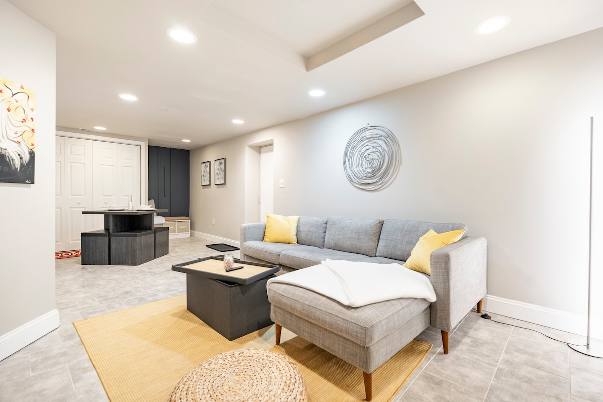 License #905695 Welcome to our sub-terrain (Lower level), modern space, nestled away in the lovely area of Mount Airy. Our space features a private full bathroom, full kitchen, dining area, washer/dryer, 55"’ smart TV (with apps to add your own account), A/C, heating system, and Wi-fi. This unit has a dedicated workspace and is ideal for a traveling professional. Additionally, this unit is equipped for a family with an ASD toddler and is an ideal location for visiting family and friends.