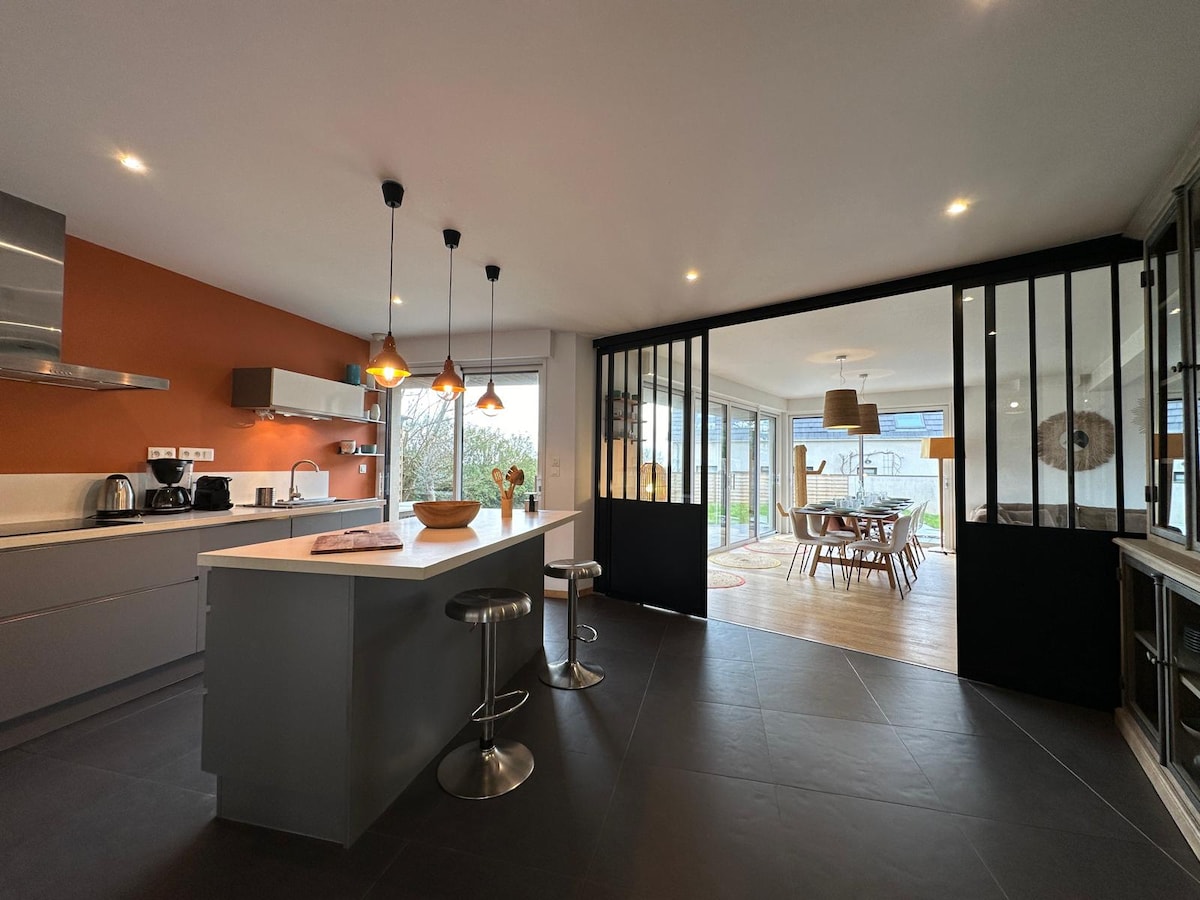 Maison de Plage, 8 personnes, située en front de mer, vue imprenable. Séjour avec poêle, cuisine ouverte avec coin bar, 2 chambres lits 160 + 2 chambres 2 lits 80, 2 SDD, 2 wc indépendants, espace TV. Terrasse bois, mobilier et parasol, plancha, 4 vélos, filets pêche. Wifi optimisé. Linge de maison fourni pressing inclus dans le coût du ménage. Produits pour le 1er petit déjeuner fournis, bois pour le poêle,appareil à raclette,gaufrier... Maison, classée 4 Étoiles par l’office du Tourisme.