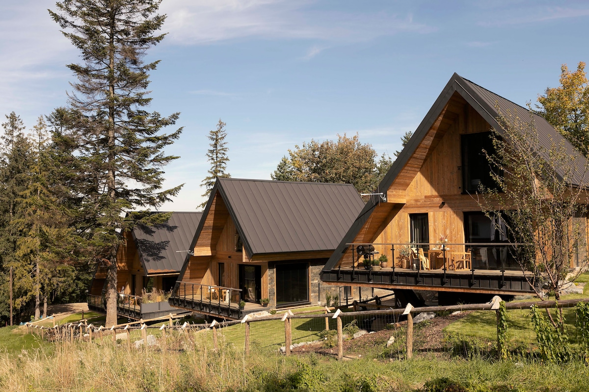 Let's start with the general idea. The buildings, topped with sloping roofs, seem to float in the air above the slope. The houses we offer to our guests were built from local slate rocks and wood obtained from old shepherds' sheds. This is our nod to local tradition, because in this place once stood such simple, farm sheds, or in highlander style - sopa.