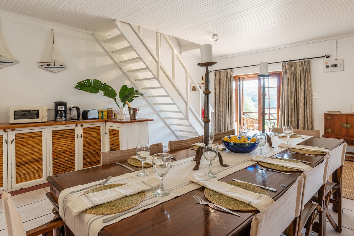 Secludedly tucked away on a green belt with animal life & veld behind gives a nature feel & sense of tranquility to the old modernised stonehouse. Inside, large windows, open plan spaces & integrated kitchen invites the ocean & river views indoors. Relax on the couch and get carried away watching the tides, whales & kite-surfers. The cozy fireplace inside will warm you up if sun-downers on the deck outside didn't. The lavish space will never lead to cabin fever, even if you have a huge family!