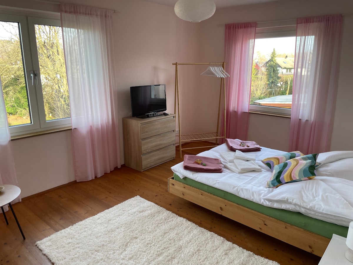 It's your little kingdom (2 rooms with private shower room) within walking distance of the university; completely newly furnished, super practical and cozy! Located on the edge of the forest! The bus stop for Witten University, Witten city center, and the S1 train line is right outside the door! 🚌 Despite the proximity, you'll have a friendly, family atmosphere; including a garden and dogs/cats, if desired. There's a room in the apartment with a mini table tennis table and darts.