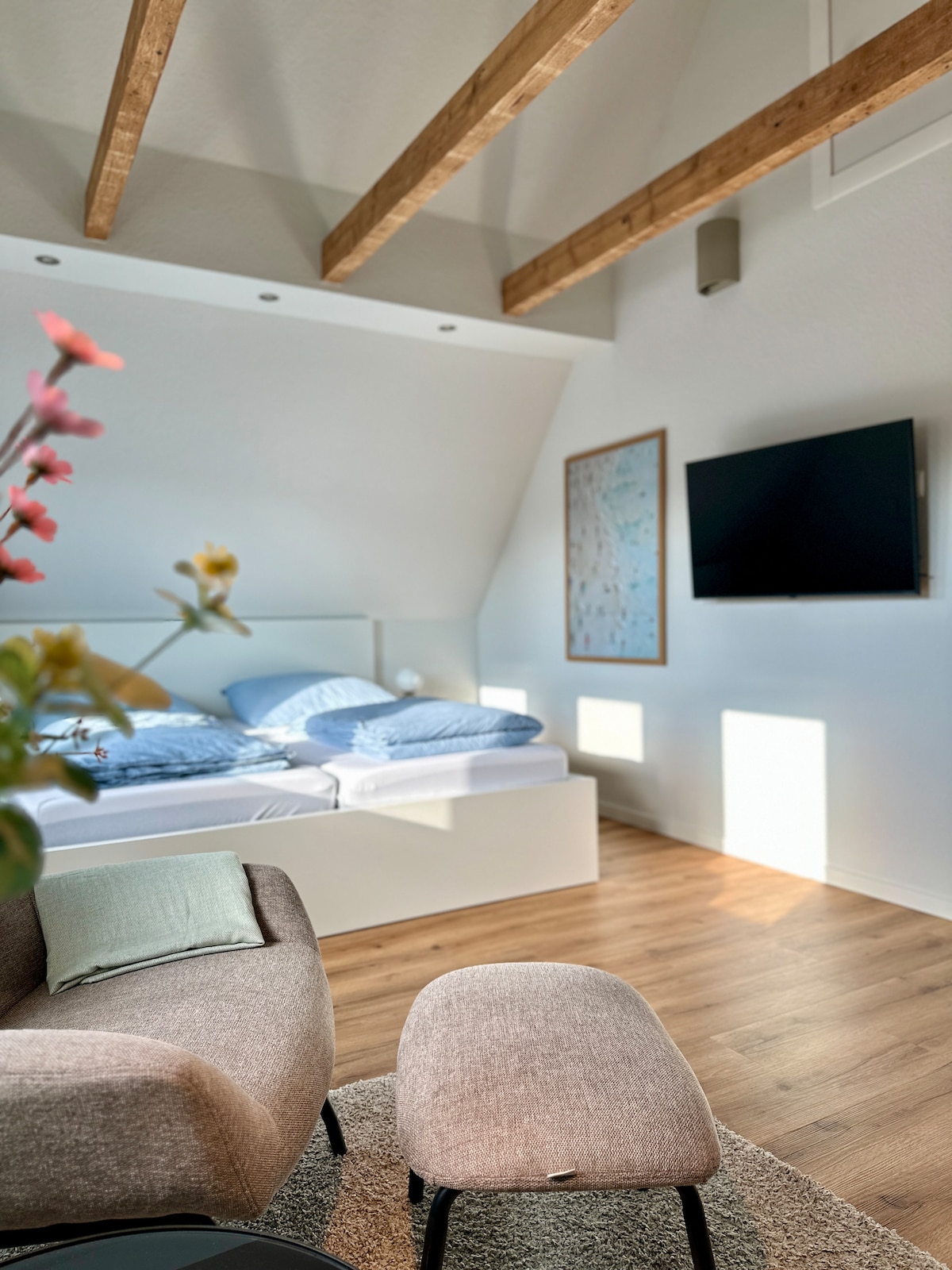 Our apartment is located in the former living area of an old and extensively renovated Gulfhof, at the foot of the dike, in the midst of a nature reserve. High ceilings, thick beams, large wooden windows with a great view into the East Frisian landscape and a modern decor with great attention to detail make this apartment a place to come down and relax.