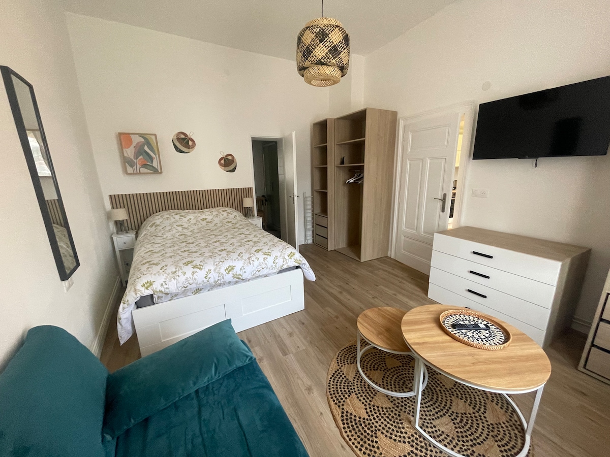 Studio de 30 m2 situé au rez-de-chaussée d’un immeuble, donnant sur une petite cour, à proximité de la Place Saint-Louis à l'entrée du centre-ville. A deux pas des commerces, marchés, restaurants. Entièrement rénové et meublé tout confort, il est composé d’un séjour avec un lit deux places (160x200), d’un coin cuisine équipée et d'une salle d'eau avec wc (et lave-linge). Une mezzanine accueille deux couchages une place.