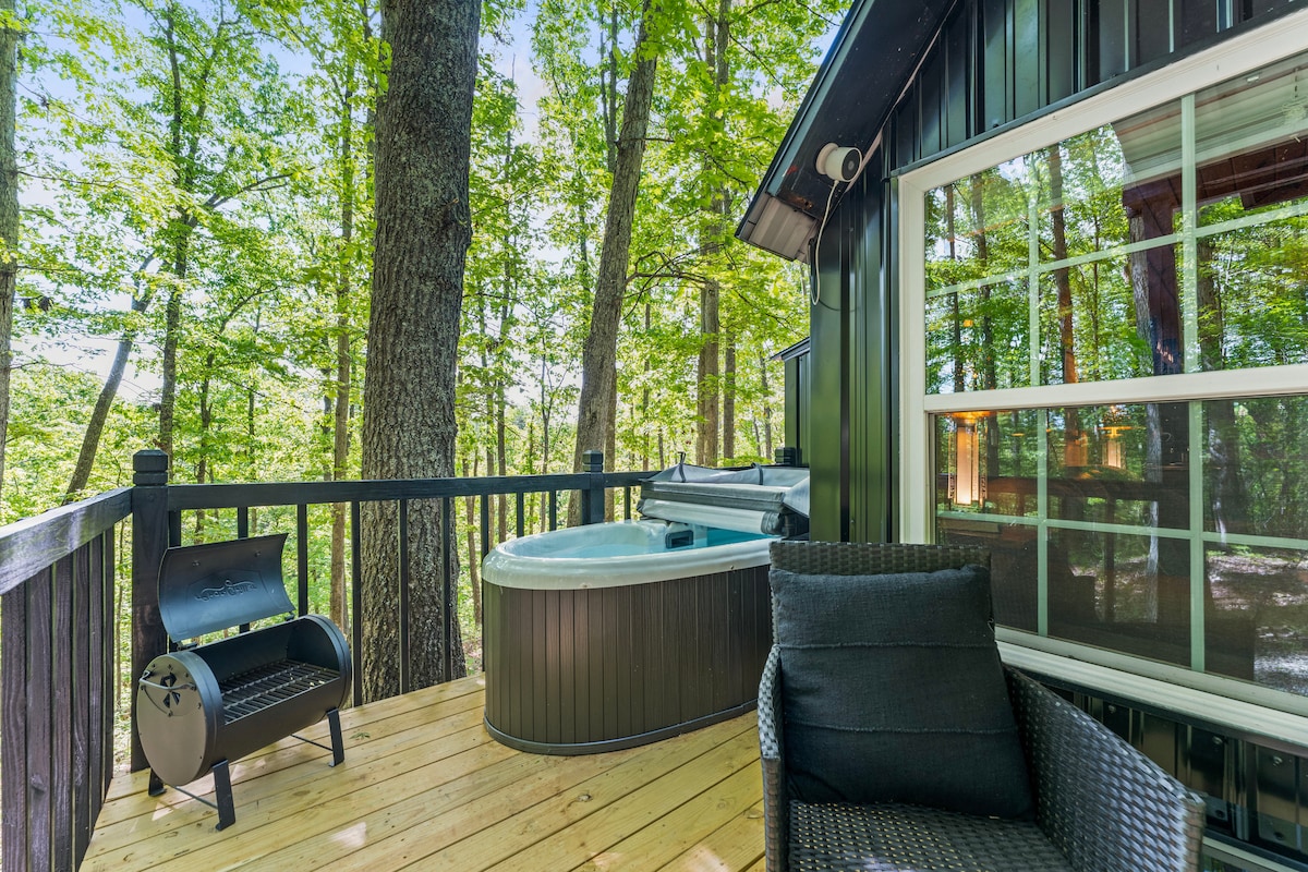 Welcome to The Raven! A luxurious all black A-frame cabin in Red River Gorge Kentucky, just 10 minutes from Natural Bridge State Park, Miguel's Pizza, and Muir Valley. We built this cabin to be so cozy you'll never want to leave. Spend the day exploring the world famous hiking trails and rock climbing, and your evening soaking up the forrest in the hot tub. Enjoy the views and peacefulness for a romantic getaway. For weddings at The Greenhouse / Appalachian Rose Farm this is the place to stay!