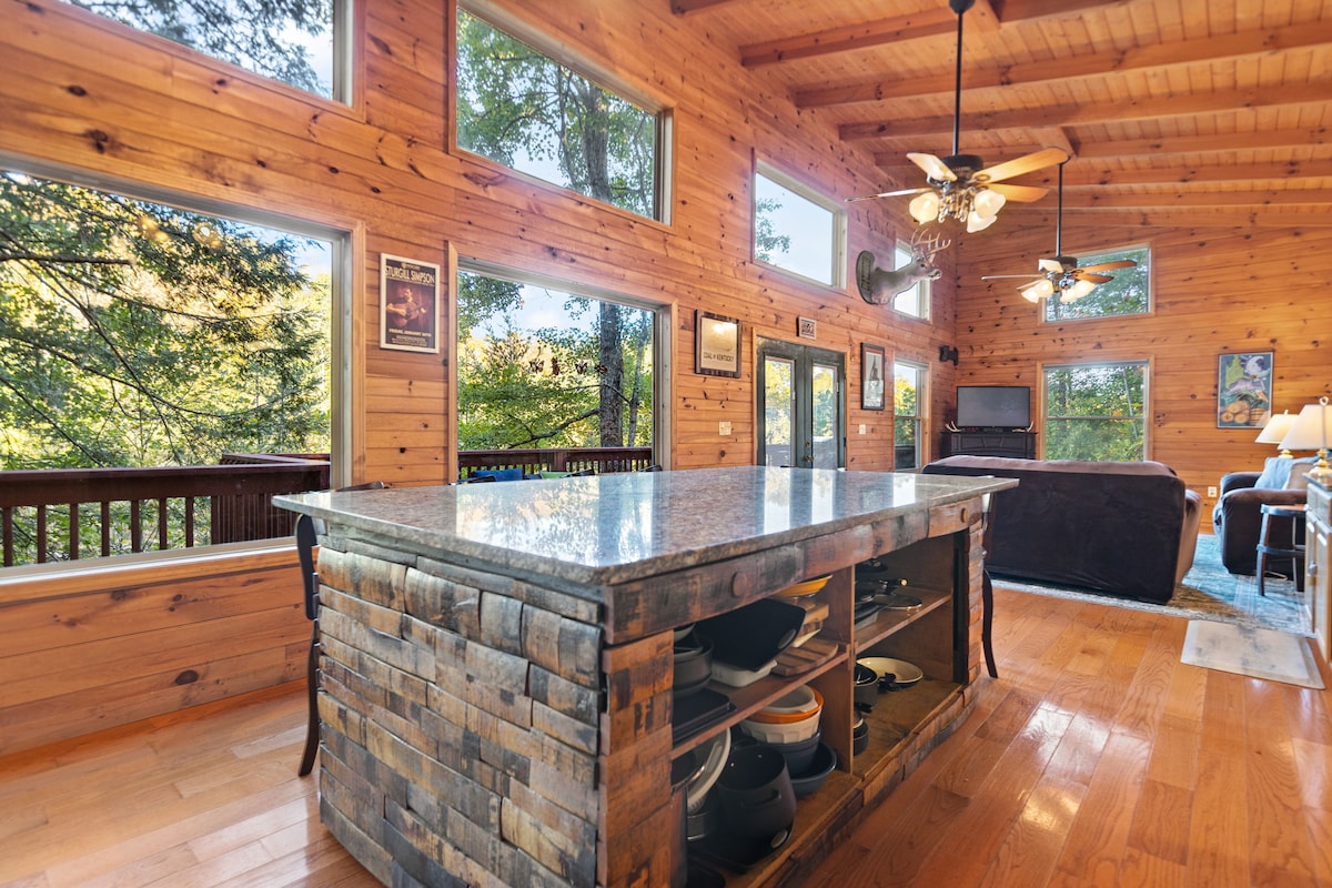 Tucked beside a quiet pond in the Red River Gorge, Dockside Cabin is designed for slow mornings, adventure days, and fireside nights. Start your morning with coffee on the dock, spend the day hiking or climbing, then come back for the hot tub, fire pit, and a quiet night under the stars. Or stay and enjoy being surrounded by trees, the clear 1.5-acre lake is stocked with fish and features a floating dock and a kayak and canoe for swimming, sunning and fishing.