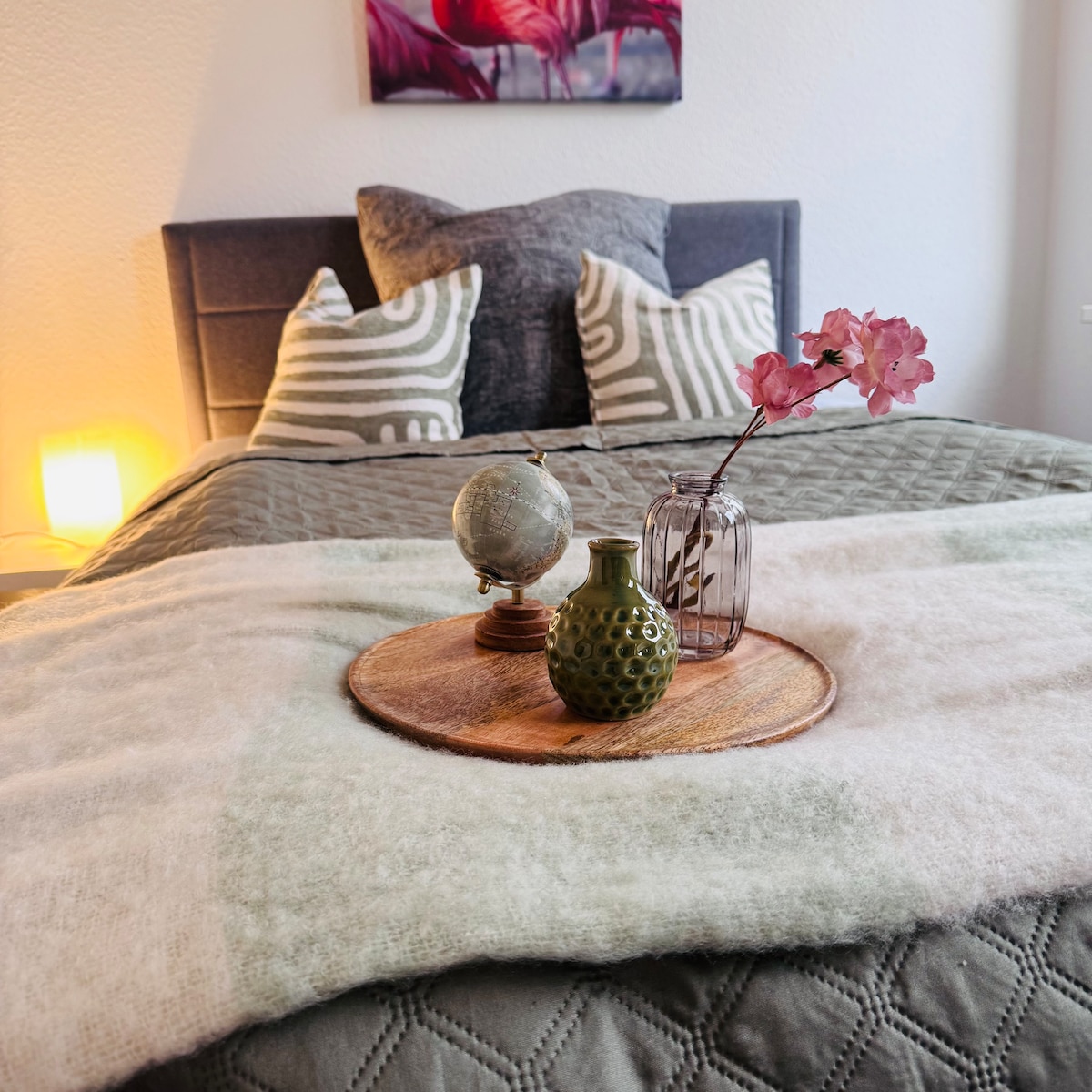 Genieße das Leben in dieser ruhigen und zentral gelegenen Unterkunft. Unsere 3 Zi. Wohnung liegt im Erdgeschoß einer ruhig gelegenen Wohnanlage. Wir haben sie komplett möbliert und liebevoll ausgestattet. Die moderne Küche ist mit einer Geschirrspülmaschine, Kühl- Gefrierkombination, Herd, Backofen, Mikrowelle, Kaffeemaschine und einem Toaster ausgestattet. Eines der Schlafzimmer hat ein 180cm Doppelbett und in dem anderen befindet sich ein großes Einzelbett (140cm).