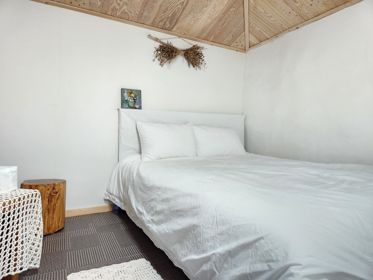 It is located in the east of Jeju Island. It is Haengwon-ri, close to the famous Woljeong Beach. I feel like a resident of Jeju Island who lives in a quiet village. The exterior is surrounded by stone walls. It is a comfortable and comfortable accommodation with modern comfort. Woljeongya is two separate houses There is a small house and a big house The house you're looking at is a "big house." two rooms/two queen beds/bathroom/kitchen/yard/terrace/parking