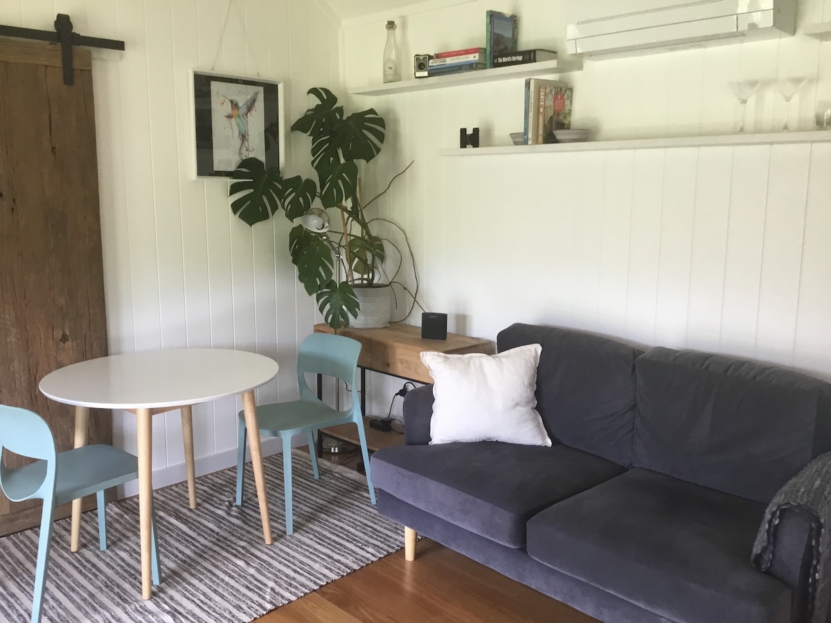 This accommodation is ideal for those who prefer the rustic charm of a historic property over modern comforts. Warm and cosy in winter, the studio was once a purpose-built kitchen of a house built in 1888. Separate entrance. Recycled furniture, large bed, sofa, original fireplace and bathroom with shower cabin. Tiny veranda and a kitchenette, shared patio. NO KITCHEN. To use the fireplace, please BYO timber. For groups of 4 PLEASE CHECK OUR TINY COTTAGE next door.