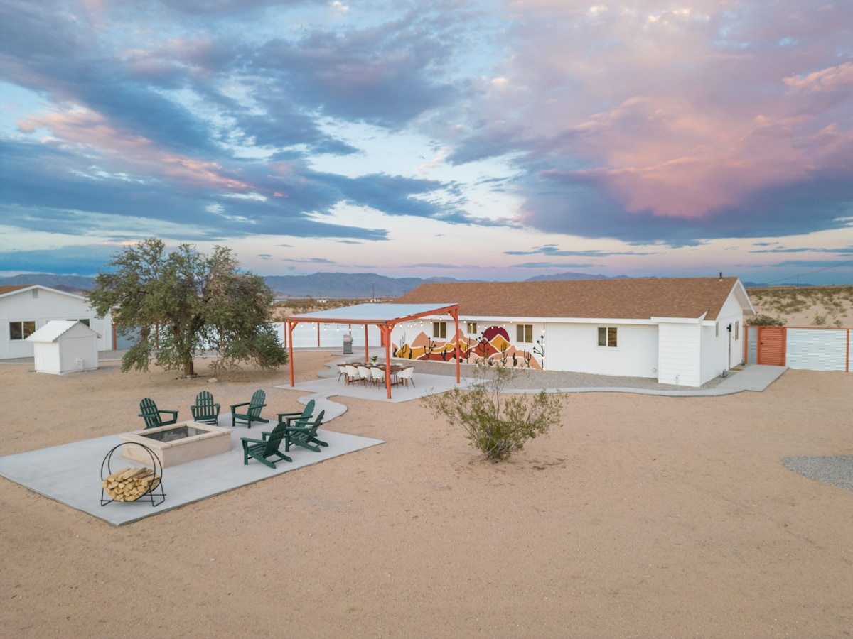 Discover the magic of Umbra Acres, a stunning 2BR Ranch home nestled on 5 acres of serene western zen landscape in Wonder Valley. Enjoy breathtaking sky views (& official "dark sky" viewing) & a range of outdoor amenities including a vintage mid century firepit, suspended hammock bed, outdoor grill, day lounge bed, bocce, corn hole, outdoor shower & dining. Explore Joshua Tree Nat'l Park or simply relax and unwind in this beautifully designed desert abode. Book now for an unforgettable escape.