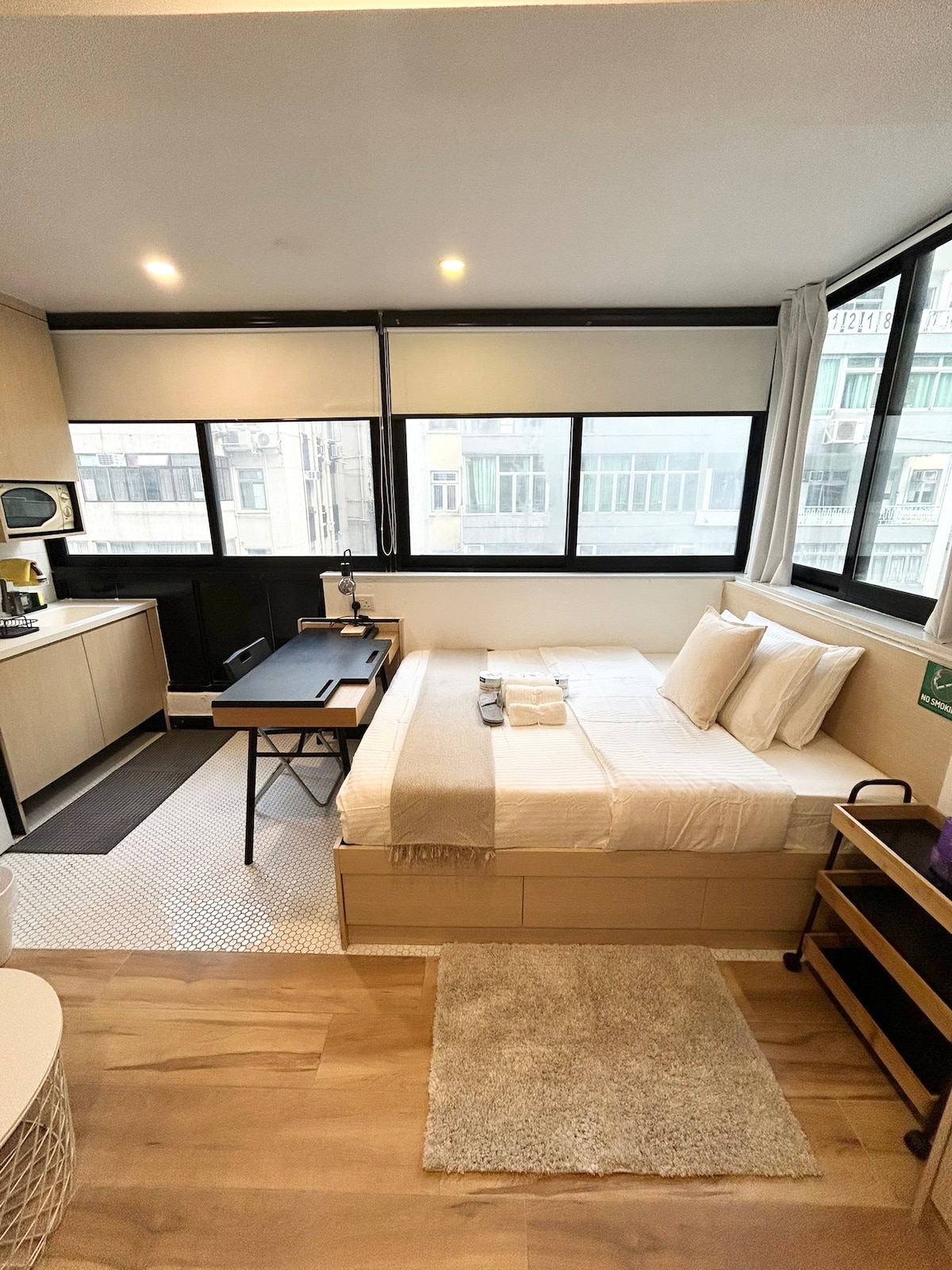 Enjoy a stylish experience at this centrally-located converted loft-style commercial space with a king bed, natural light, workspace, modern design, fast and stable wifi, washer/dryer, exercise equipment, folding bike, ample storage space, TV with Netflix and Playstation, Roomba, and a rooftop. The apartment is a 5-floor walk up located 1-min walk from Sheung Wan MTR station. The location is very convenient. The kitchenette is basic with an induction, toaster oven, steamer, utensils, etc