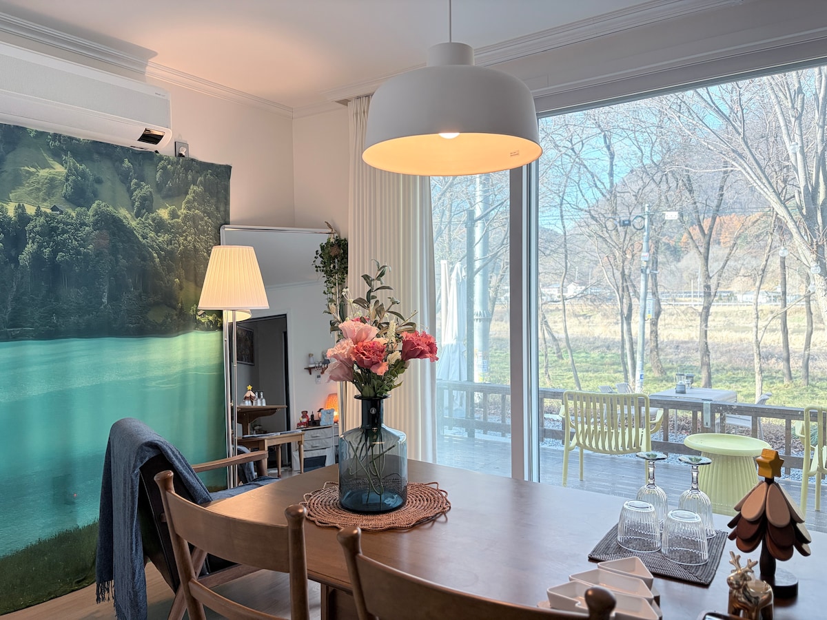 Spacious private retreat nestled in the serene nature of Gapyeong, offering the perfect setting for unforgettable moments. Youโll wake to warm sunlight and end your day beneath a sky overflowing with stars. With over 165 square meters of indoor space and over 1,300 square meters outdoors, is perfectly suited for family getaways, gatherings with friends, and workshops. Thoughtfully designed amenities and warm hospitality await, making your time with loved ones even more meaningful and enjoyable.