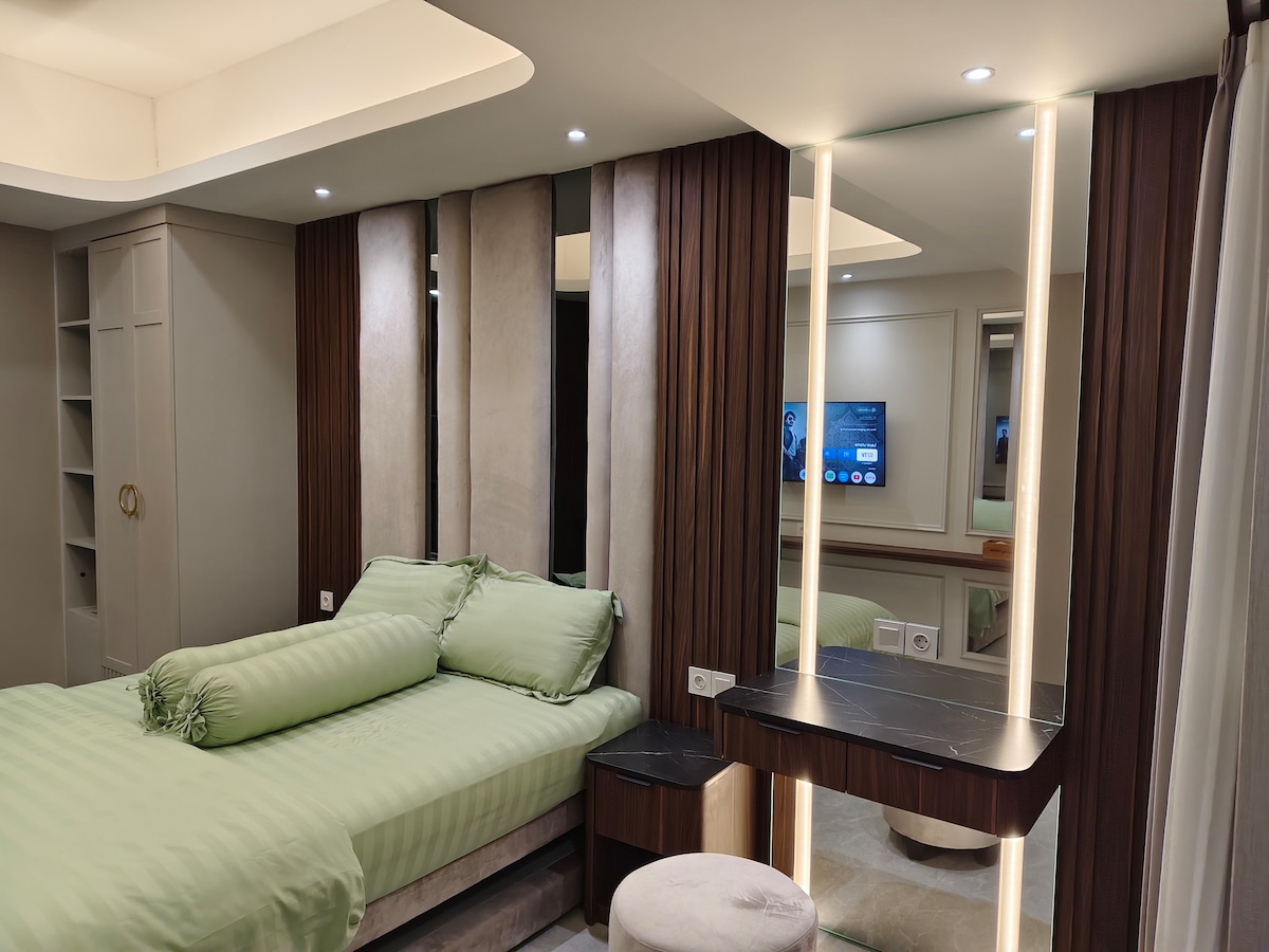 NEW 2 Bedroom Bella Exclusive Apartment, Pakuwon City Mall (min. 7-night stay) 1BR with King Size Bed 1BR with Single Bed What's Included: • Connected to Pakuwon City Mall 3 • Free Wi-Fi • Smart TV • Kitchenette with microwave & stove • Washing machine • Water heater • Clean towels • Drying rack ⚠️ Please read before booking ⚠️ ✅ Ada biaya deposit untuk sewa bulanan/tahunan ✅ Kartu parkir gratis untuk 1 kendaraan 🚫 Dilarang merokok di area apartemen 🚫 Dilarang membawa hewan peliharaan